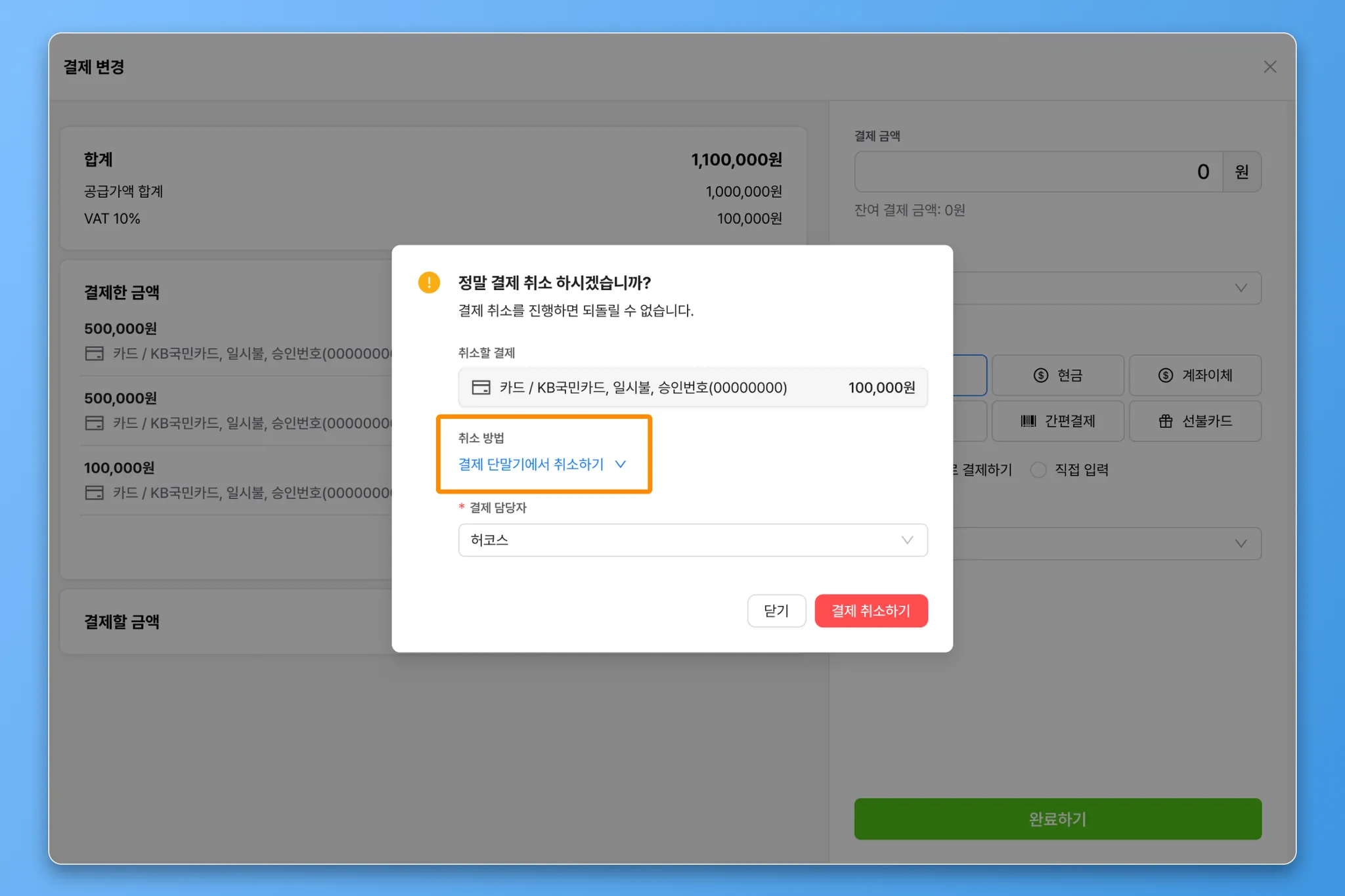 결제 변경의 결제 건의 결제취소 를 눌러 시작할 수 있습니다.