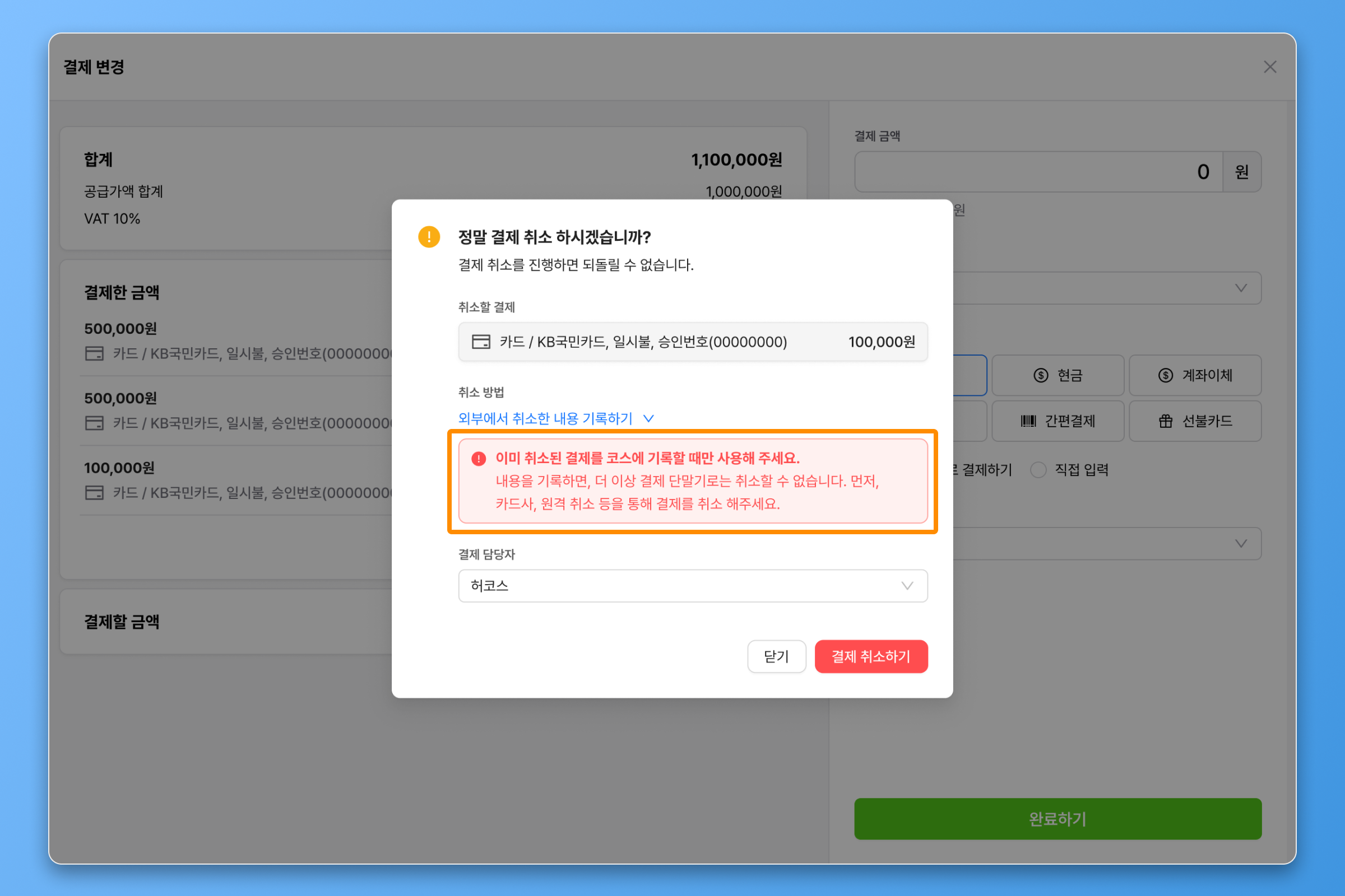 외부에서 취소한 내용 기록하기 를 선택하여 결제 취소를 하는 경우, 해당 결제 건은 단말기를 통한 취소가 불가능 합니다.