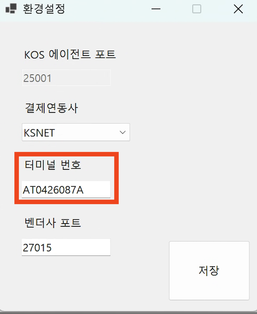 터미널 번호 설정 뒤 저장을 누르면, KOS 결제 에이전트 프로그램에 설정이 적용되고 재 실행돼요.