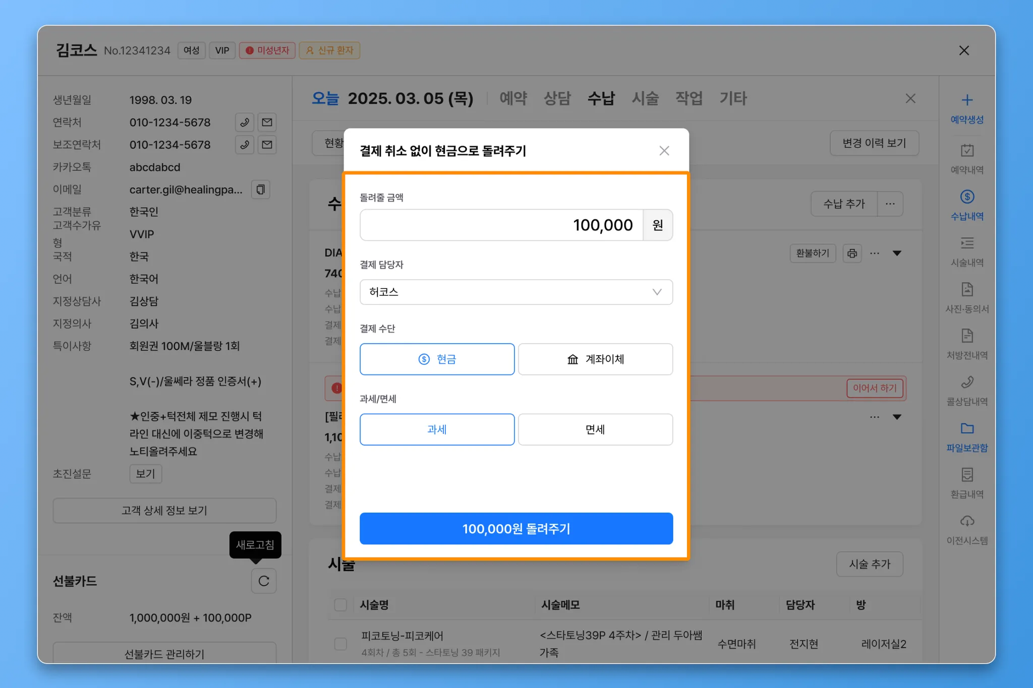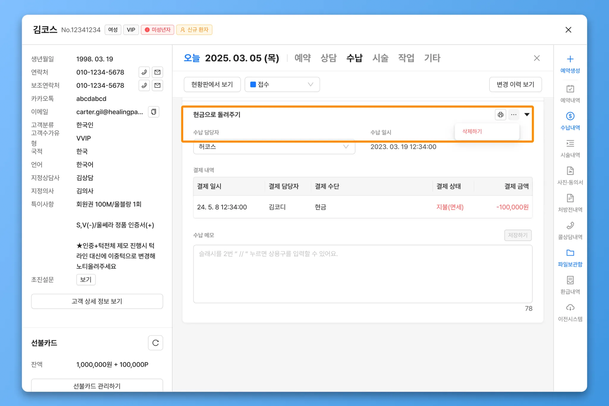 현금으로 돌려주기수납이 생성됩니다.해당 수납에서 상세 정보를 확인할 수 있으며, 취소해야 할 경우, 수납을 삭제하여 기록을 지워주세요.