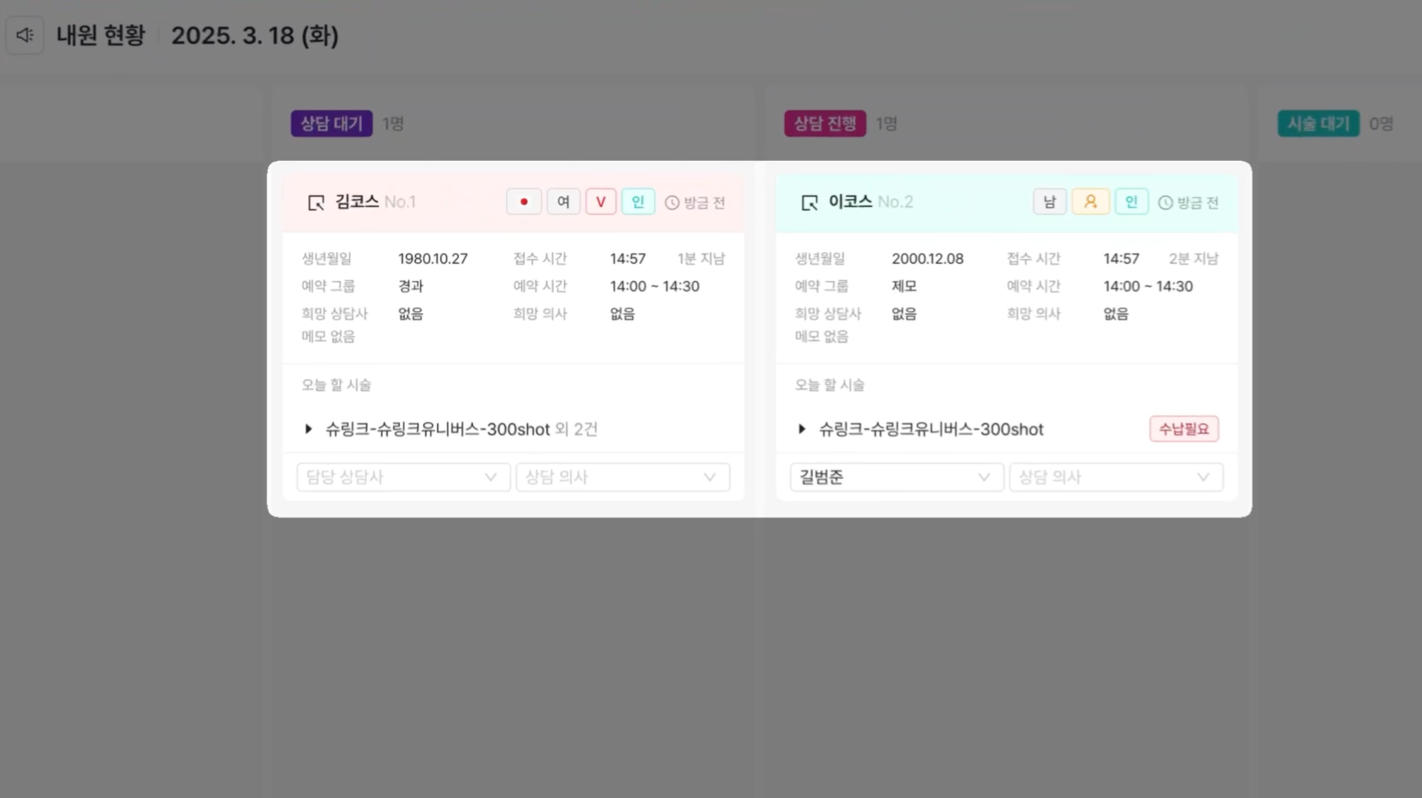 예약부터 귀가까지 모든 과정에서 색상과 태그를 통해 빠르게 확인할 수 있습니다.