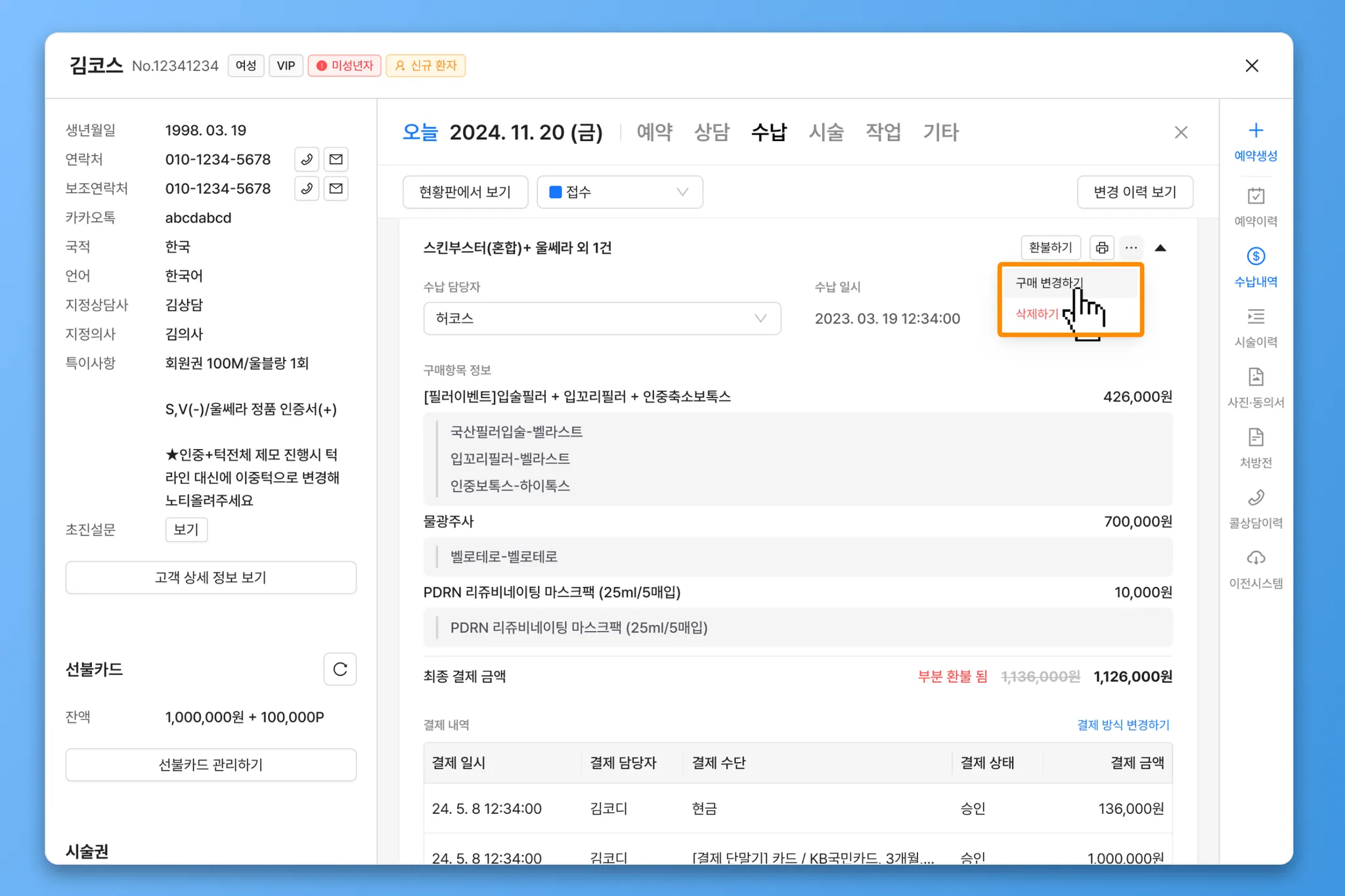 구매 변경된 구매항목의 시술권 및 회차정보는 모두 삭제 되므로 사용한 시술을 삭제하는 경우, 추후 수납의
