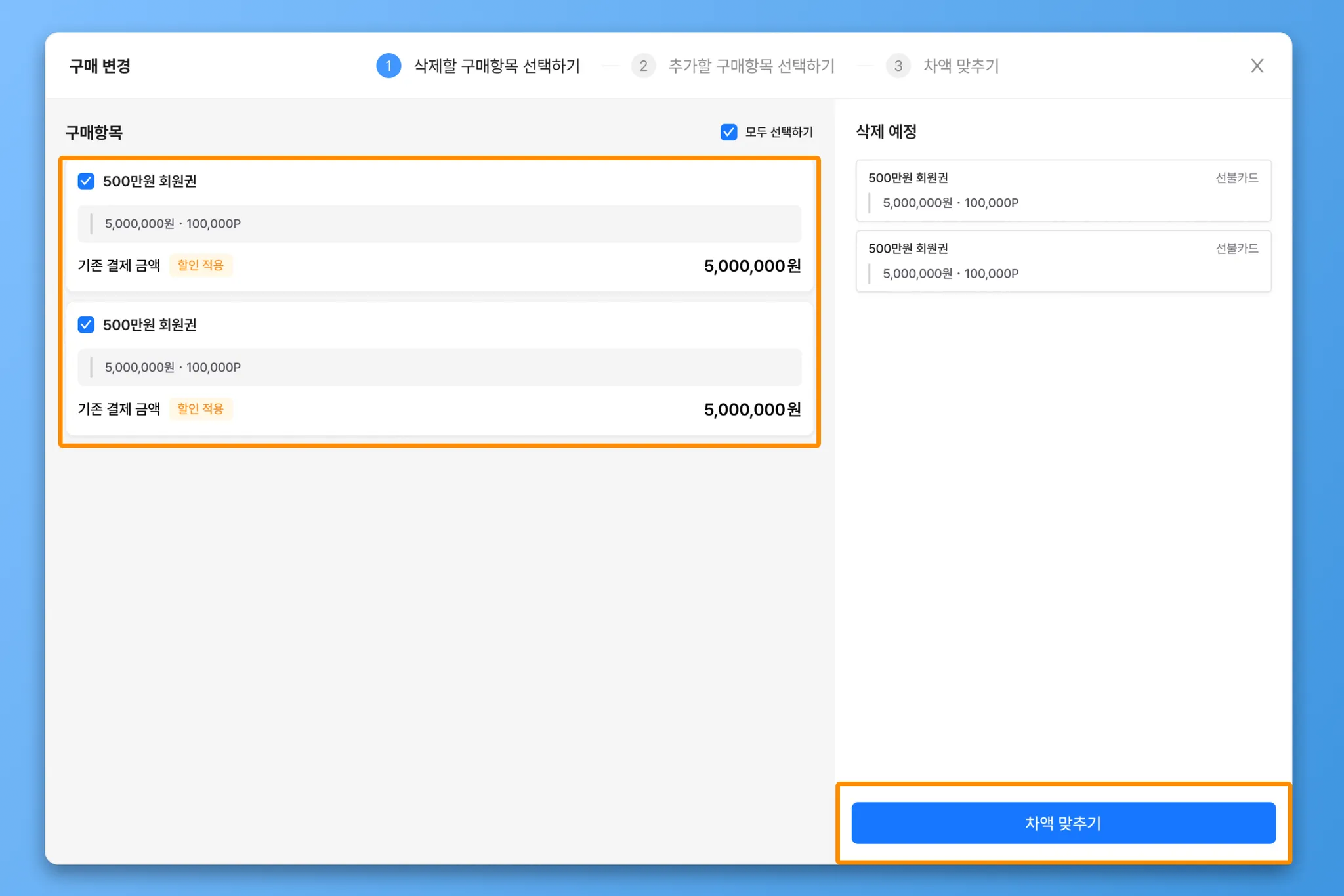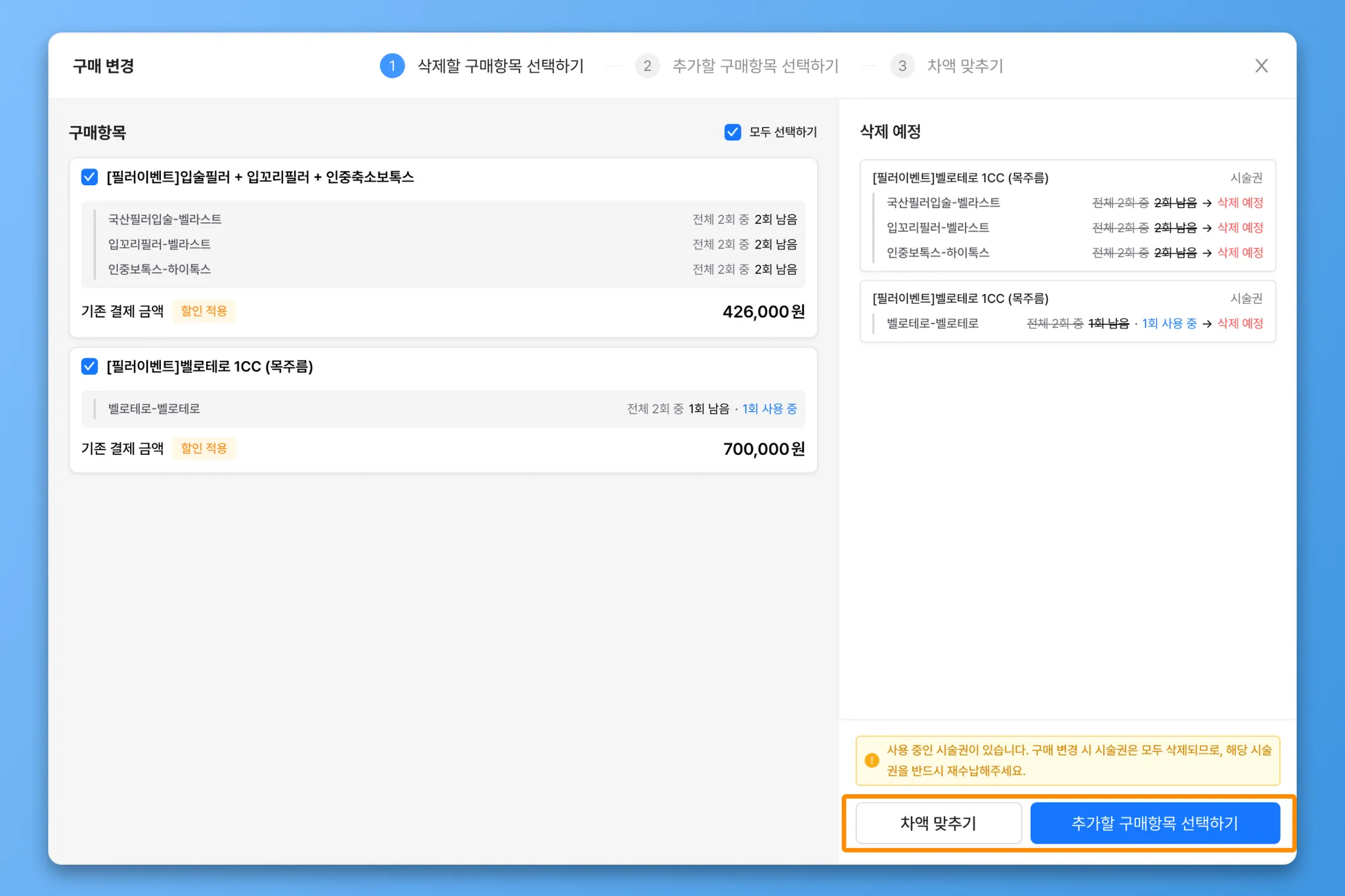 삭제할 구매항목 선택 > 추가할 구매항목 선택 > 차액 맞추기 순으로 진행됩니다.