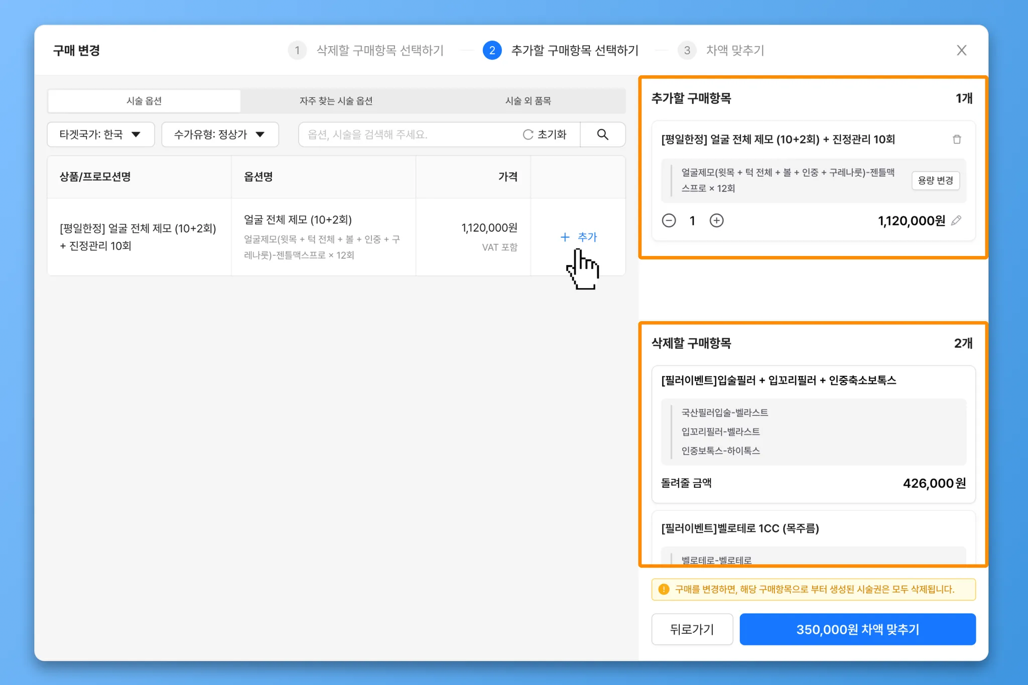 추가할 항목은 별도로 선택하지 않고, 구매항목의 삭제만 진행하여, 해당 구매항목의 시술권과 시술권의 회차 정보를 모두 삭제합니다. 사용 중인 시술권이라면 반드시 재수납해야 합니다.