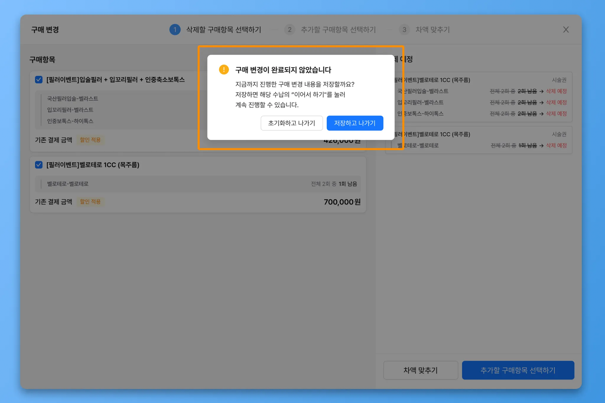 구매 변경이 완료되지 않은 상태에서 이탈 시, 초기화 또는 구매 변경 절차를 저장할 수 있습니다.