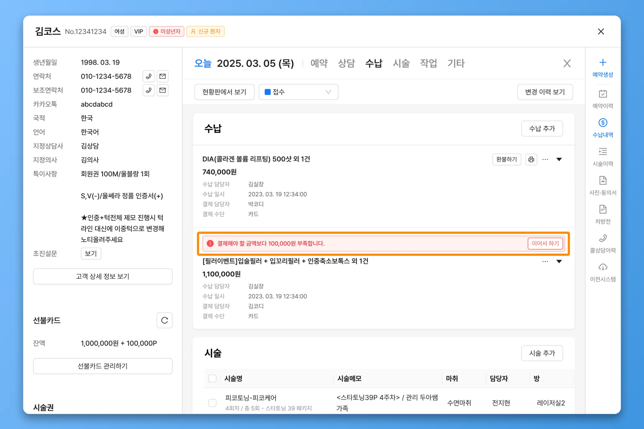 구매항목을 삭제하는 경우, 기존의 시술권이 삭제되므로 반드시 추후 수납을 진행해야 합니다.