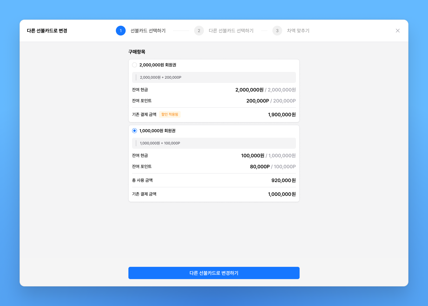 • 기존 선불카드의 결제 금액을 그대로 유지하면서, 차액만 추가 결제하여 새로운 선불카드로 변경할 수 있습니다.
