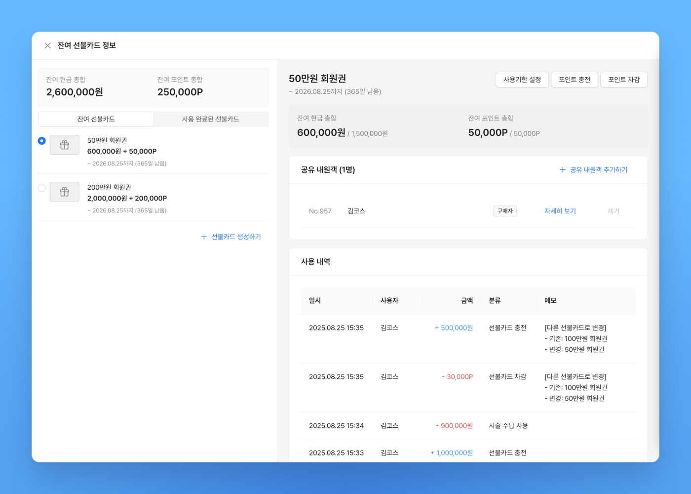 • 180만원 사용한 500만원 선불카드를 180만원 사용한 200만원 선불카드로 변경 가능합니다.