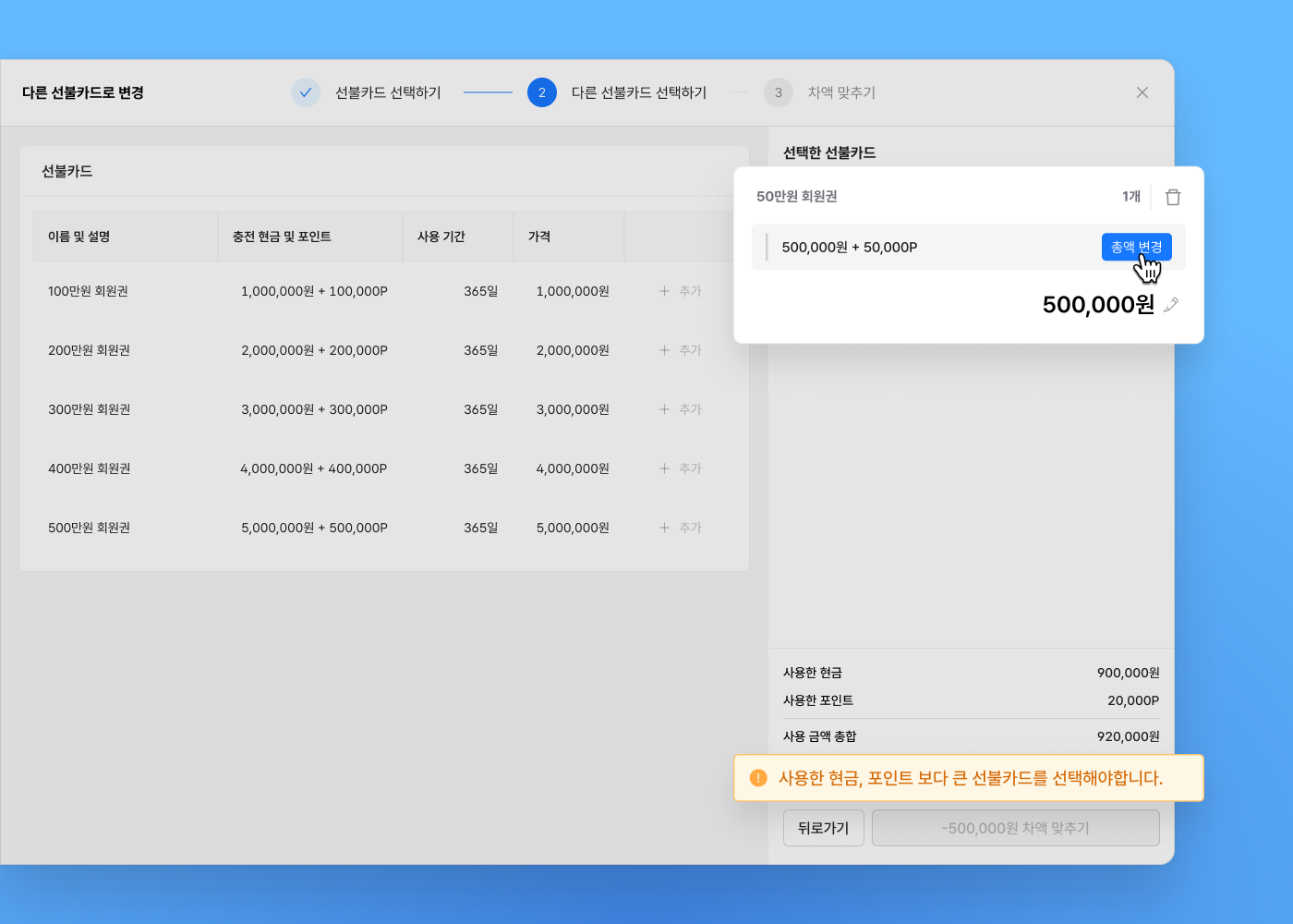 • 선택한 새 선불카드가 기존 선불카드의 잔여 금액보다 크거나 같아야 다음 단계로 넘어갈 수 있습니다.