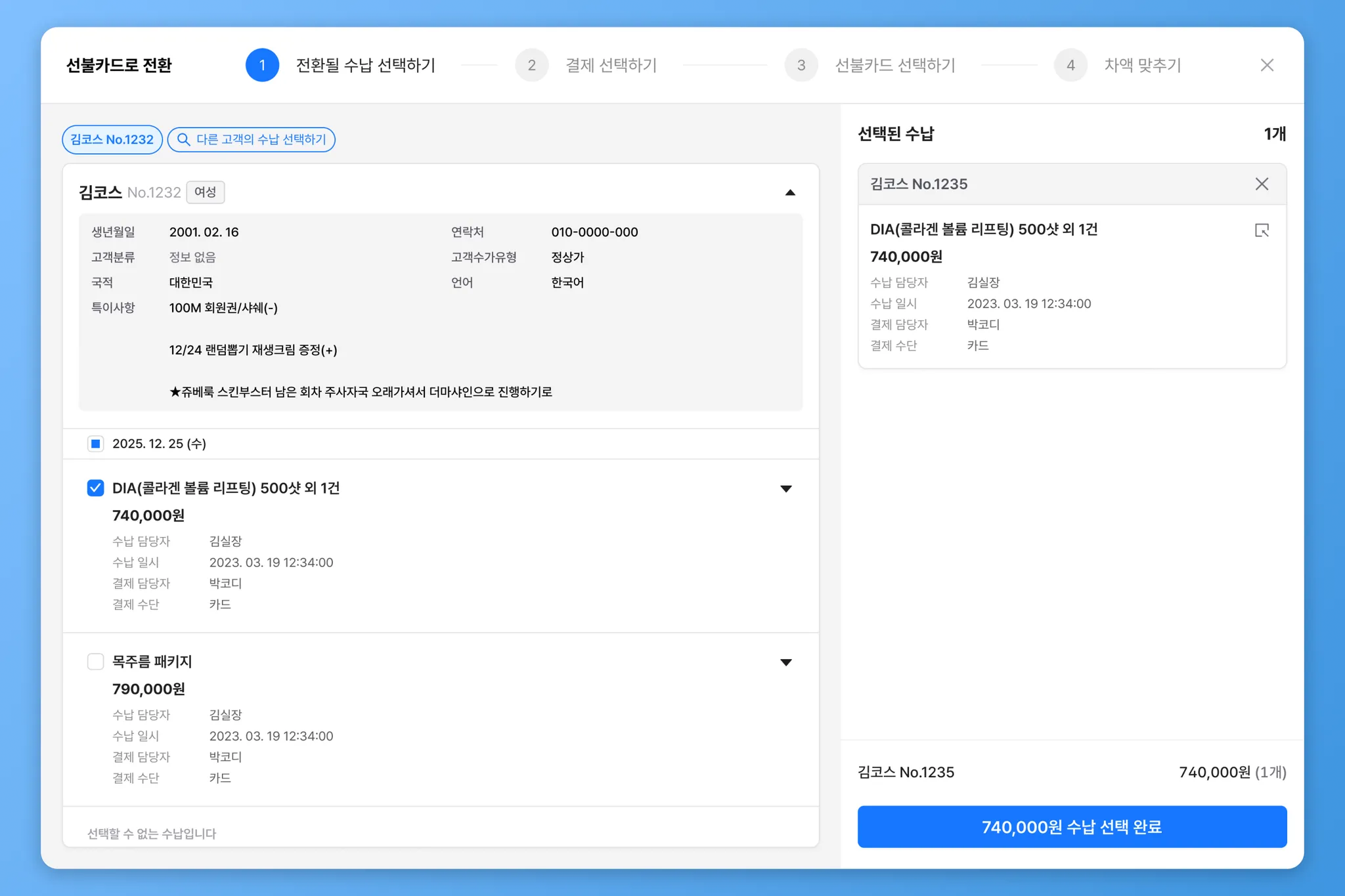 기존 시술 수납에 새로 구매한 선불카드로 결제가 추가됩니다.