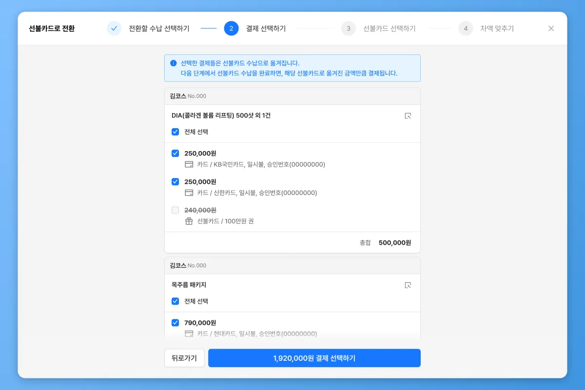 기존 시술들을 선불카드로 구매한 뒤 결제한 것처럼 바꿀 수 있습니다.