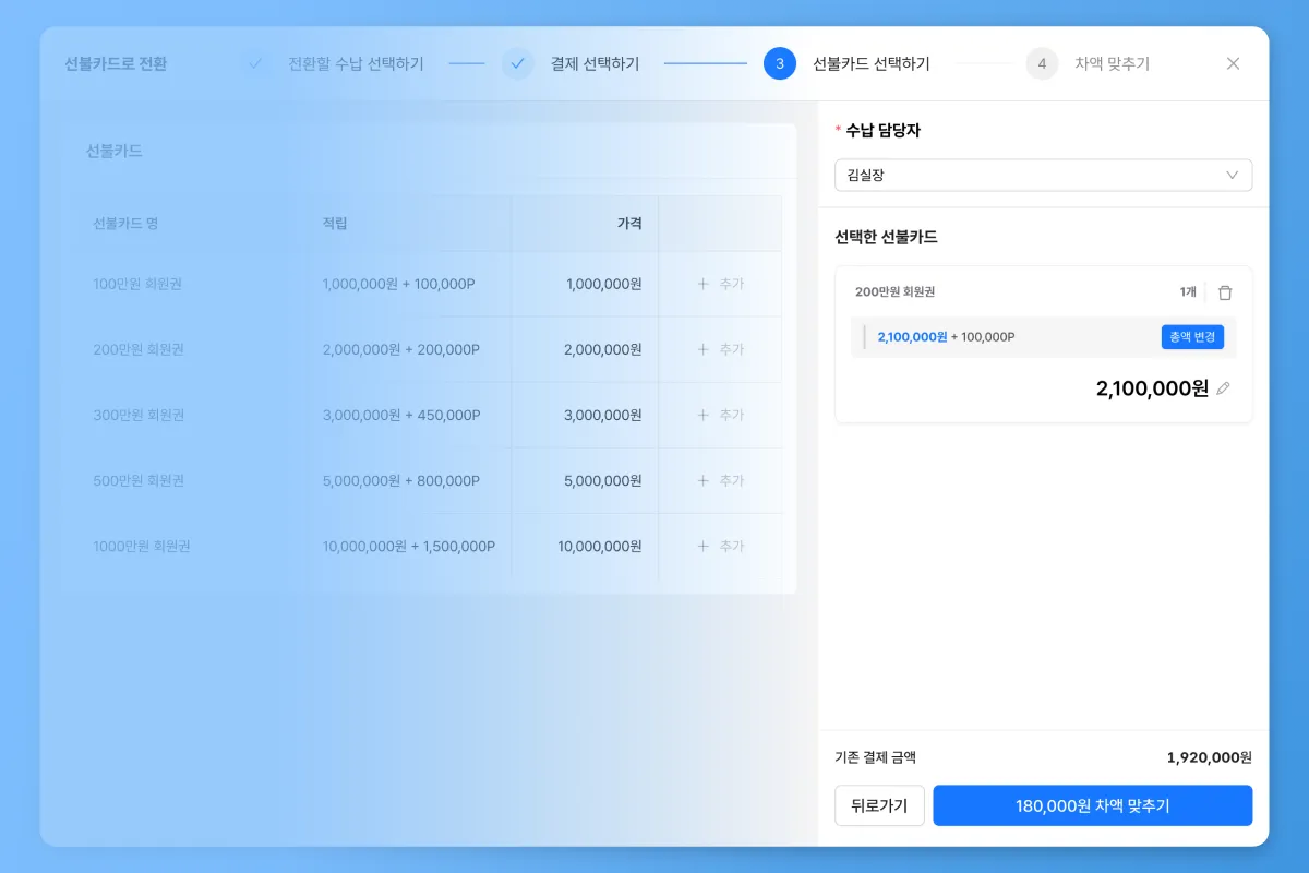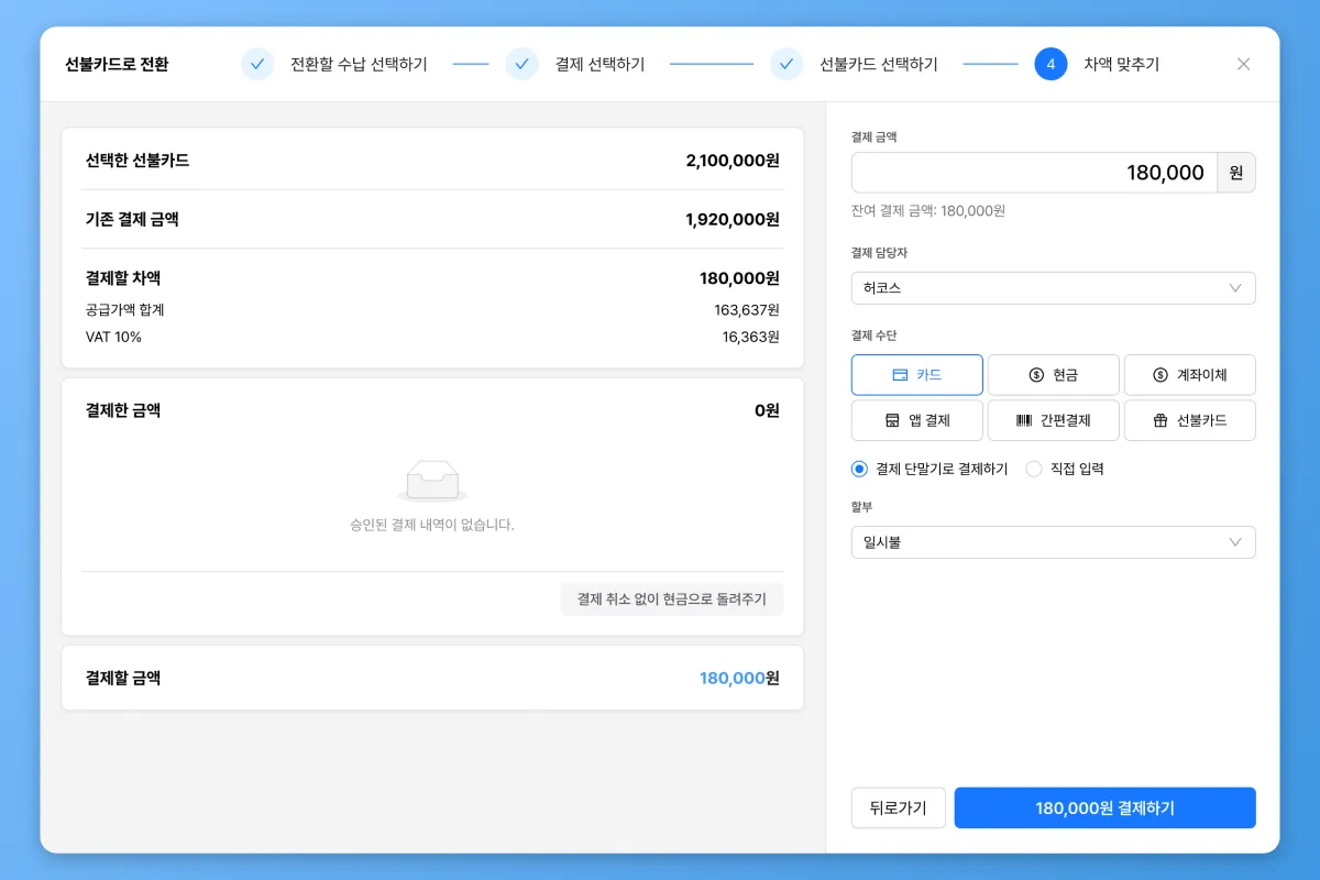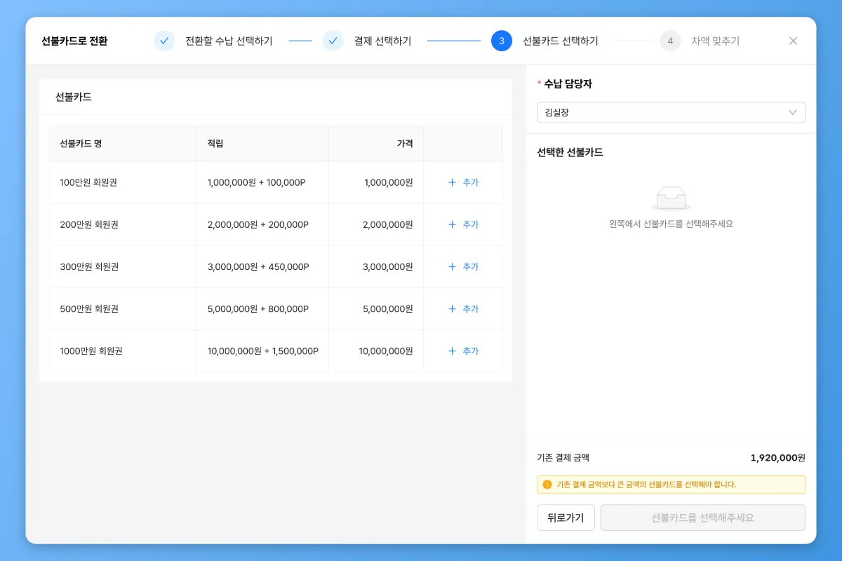 선택한 선불카드가 기존 결제 금액보다 크거나 같은 금액이어야 ‘차액 맞추기’ 단계로 넘어갈 수 있습니다.