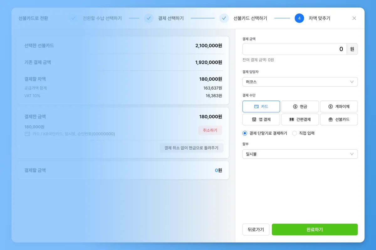 모든 차액을 결제한 뒤, [완료하기] 버튼을 클릭하여 전환을 완료합니다.