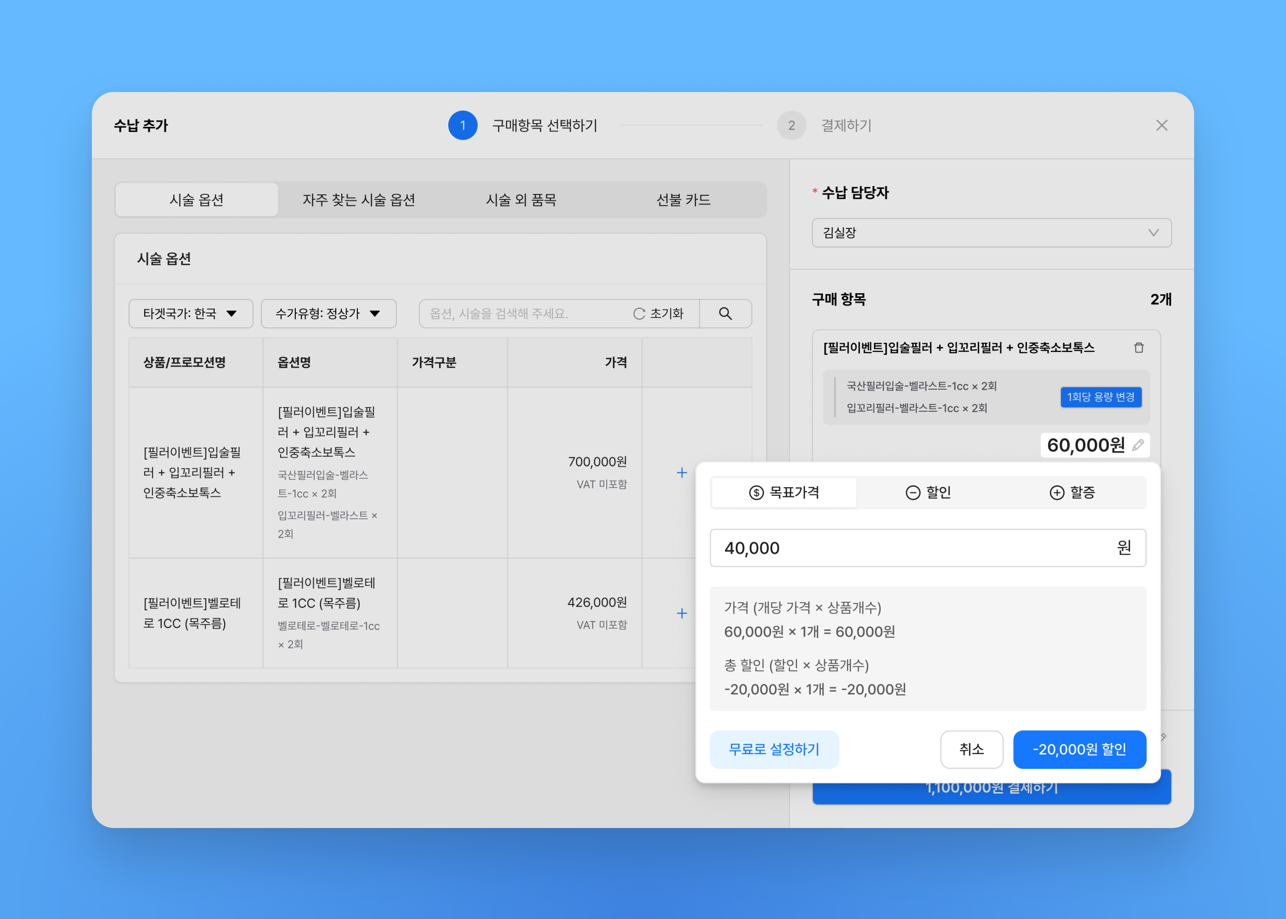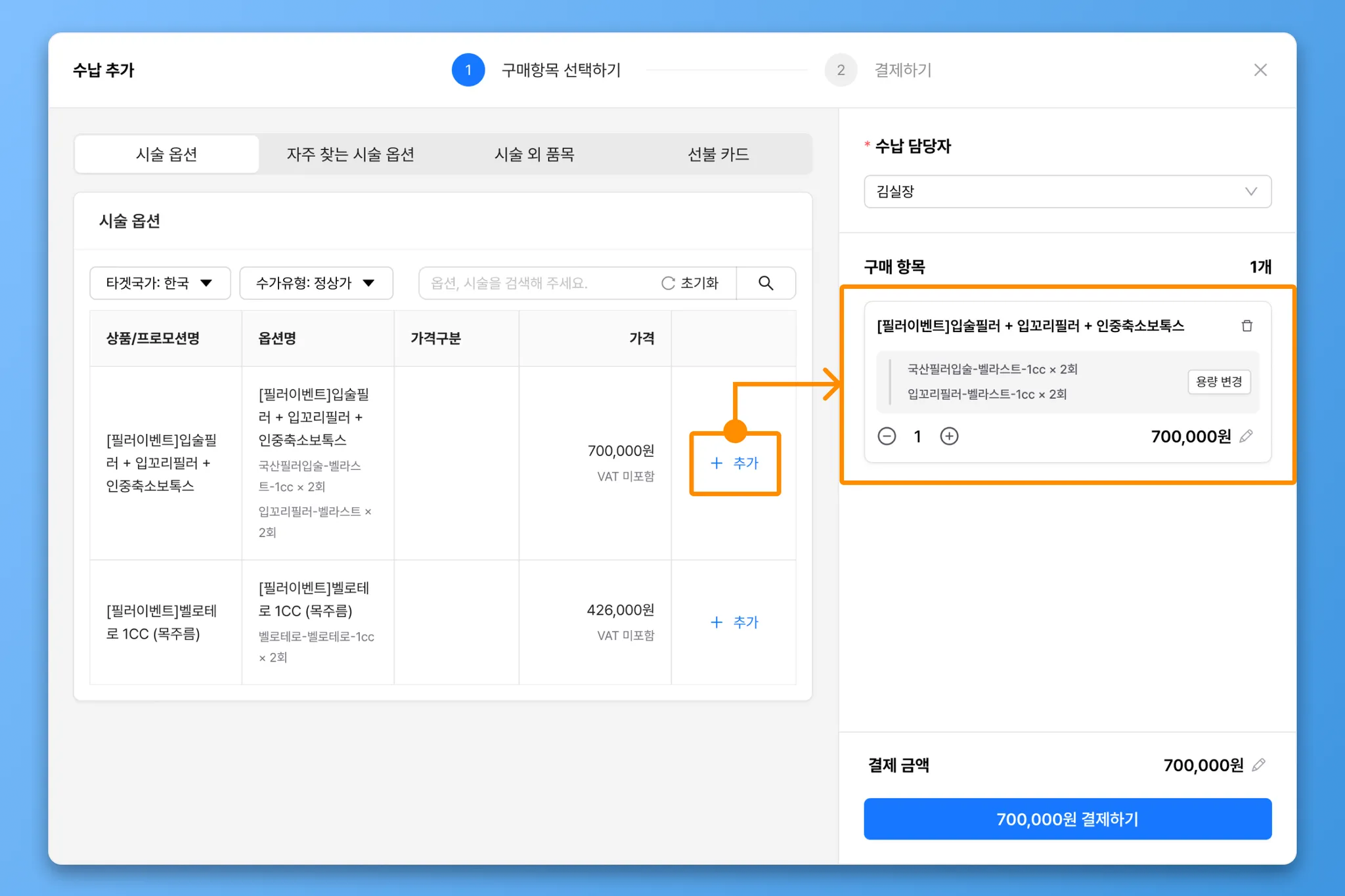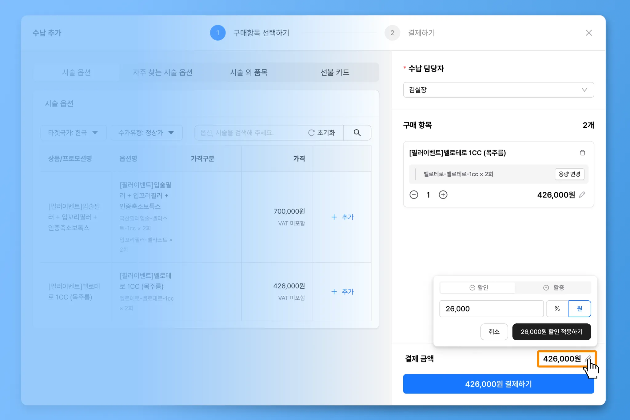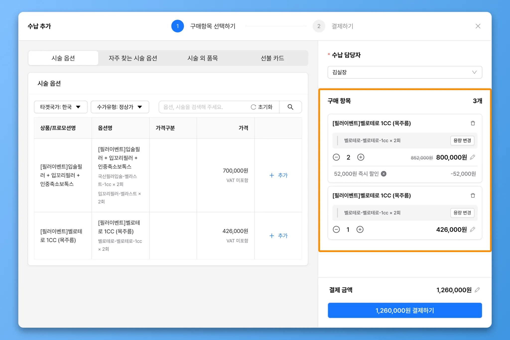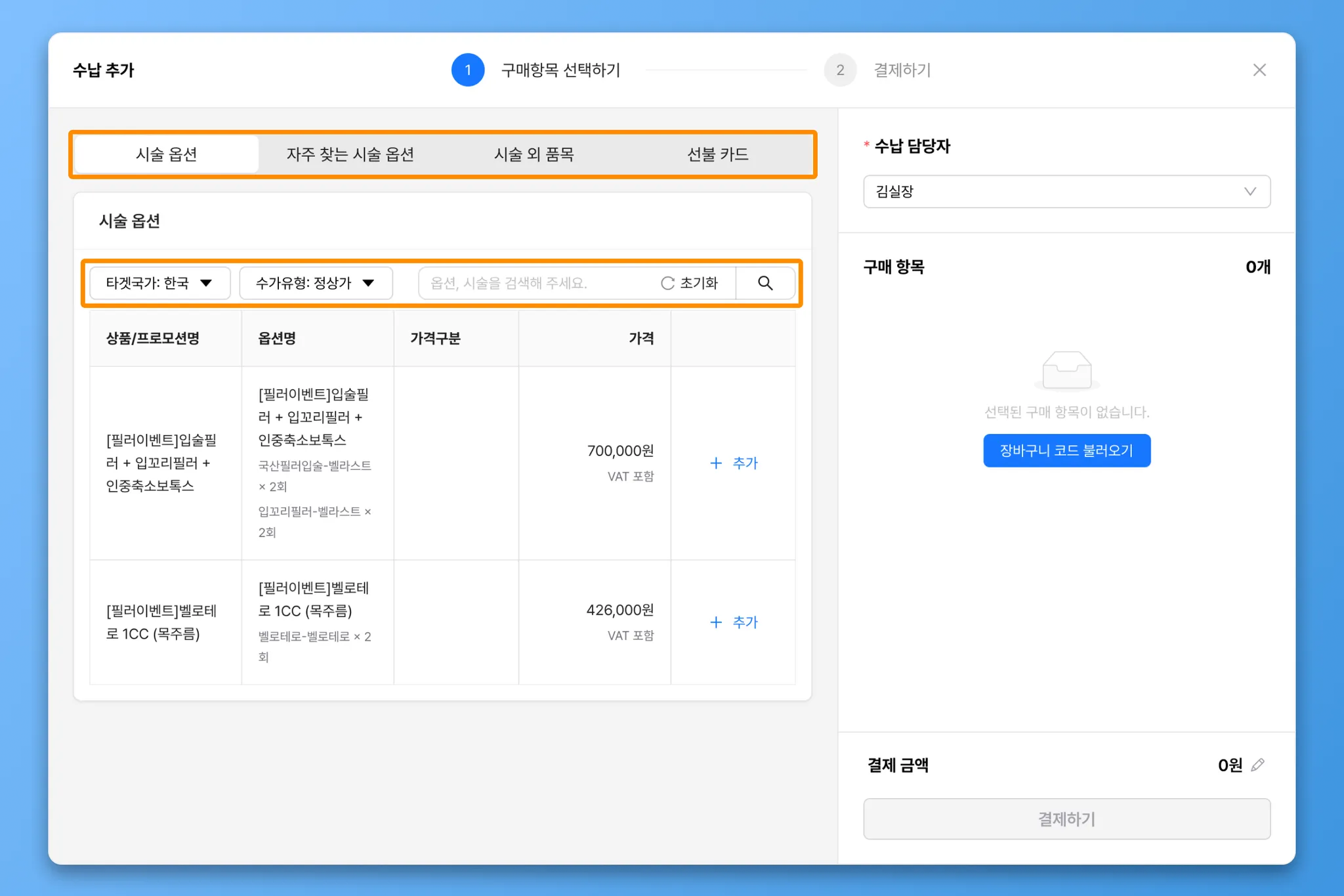 구매항목은 시술 옵션, 자주 찾는 시술 옵션, 시술 외 품목, 선불카드 중에서 선택할 수 있습니다.