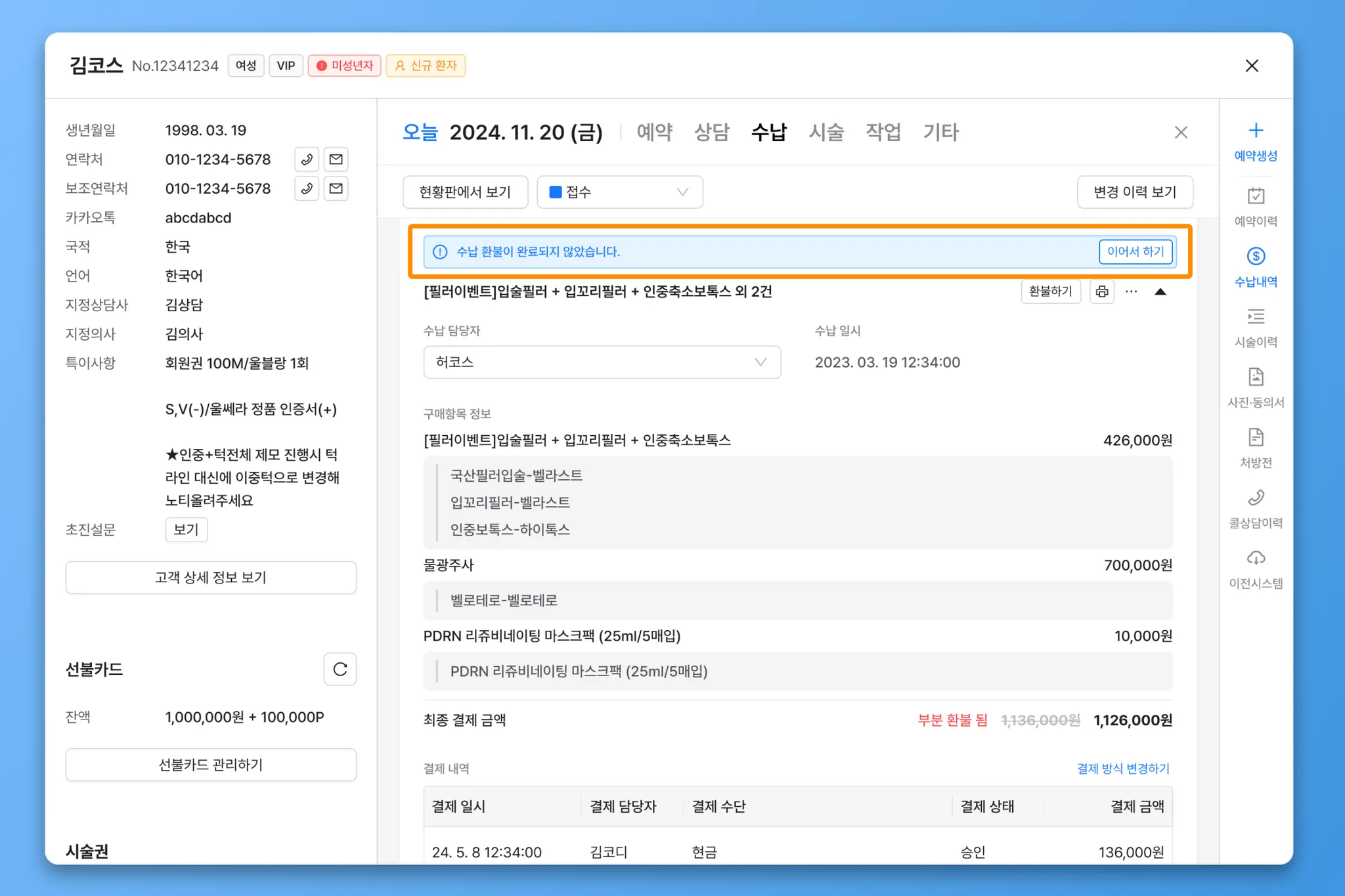 선불카드 환불은 시술 또는 시술 외 품목과 함께 결제할 수 없습니다.