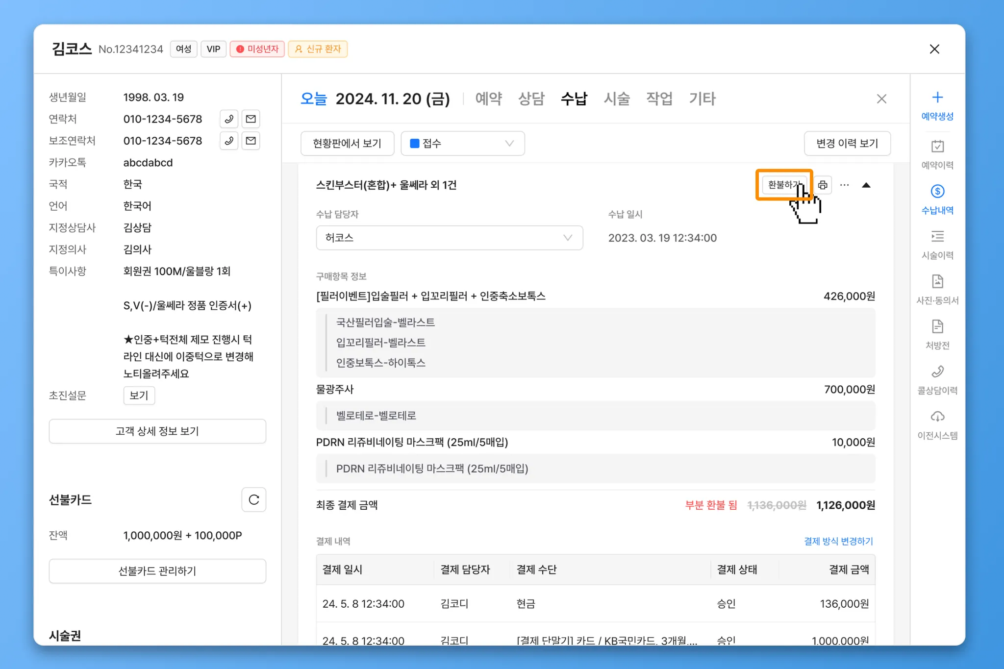 환불하기를 눌러 환불을 시작할 수 있습니다.결제 금액 초과 또는 부족한 수납역시 환불을 진행할 수 있습니다.결제 금액 초과 또는 부족한 수납상태를 먼저 해결하고 싶다면 결제 변경하기를 사용해주세요.