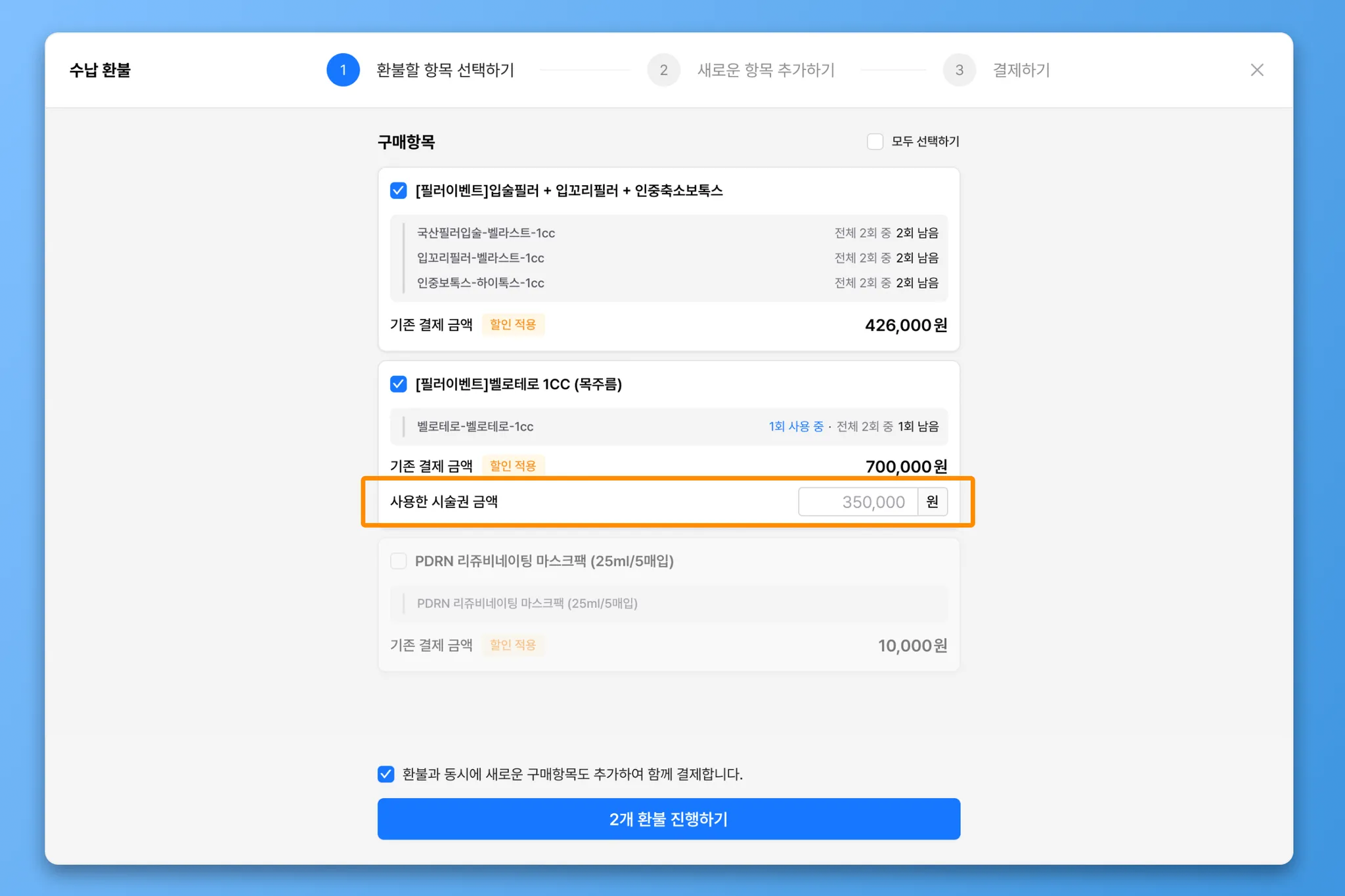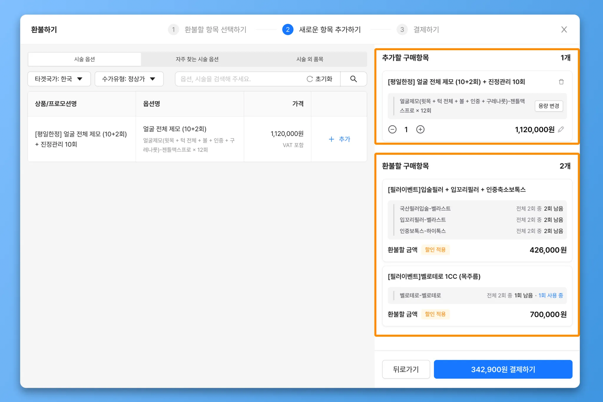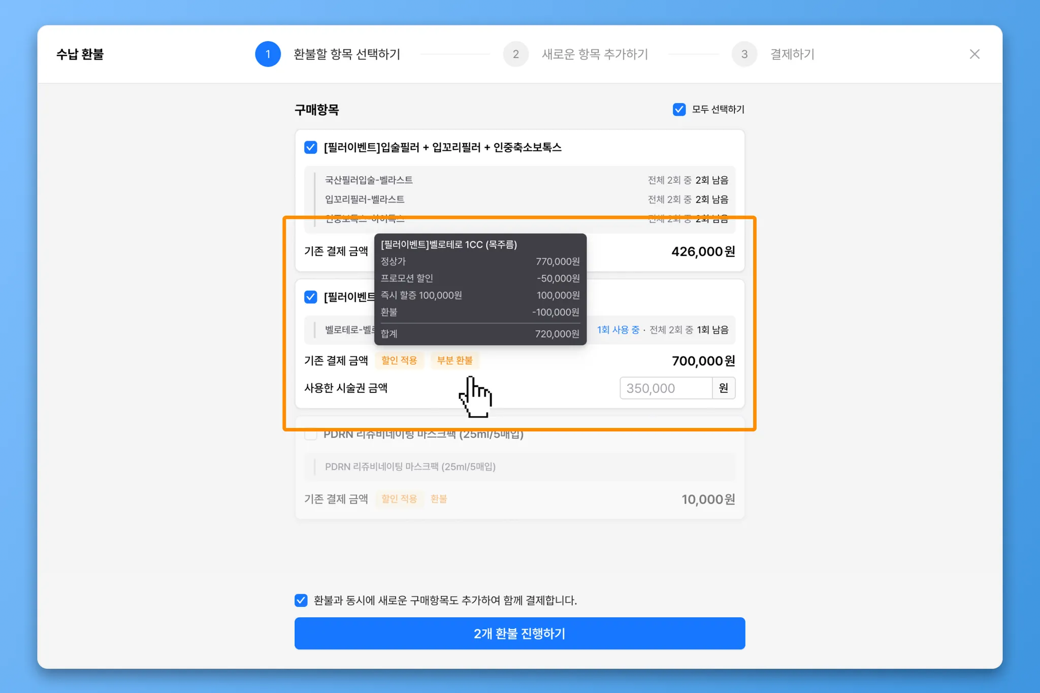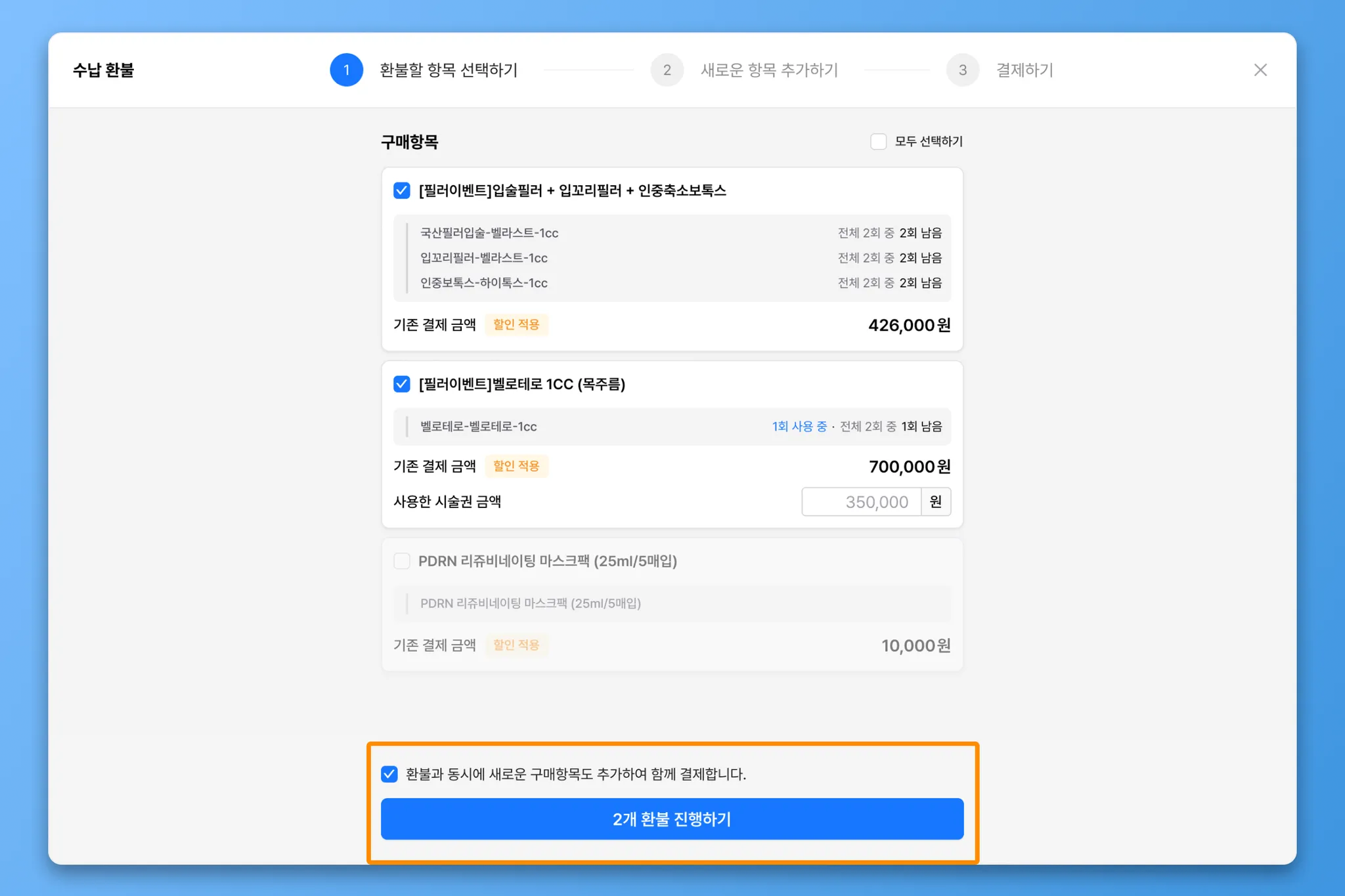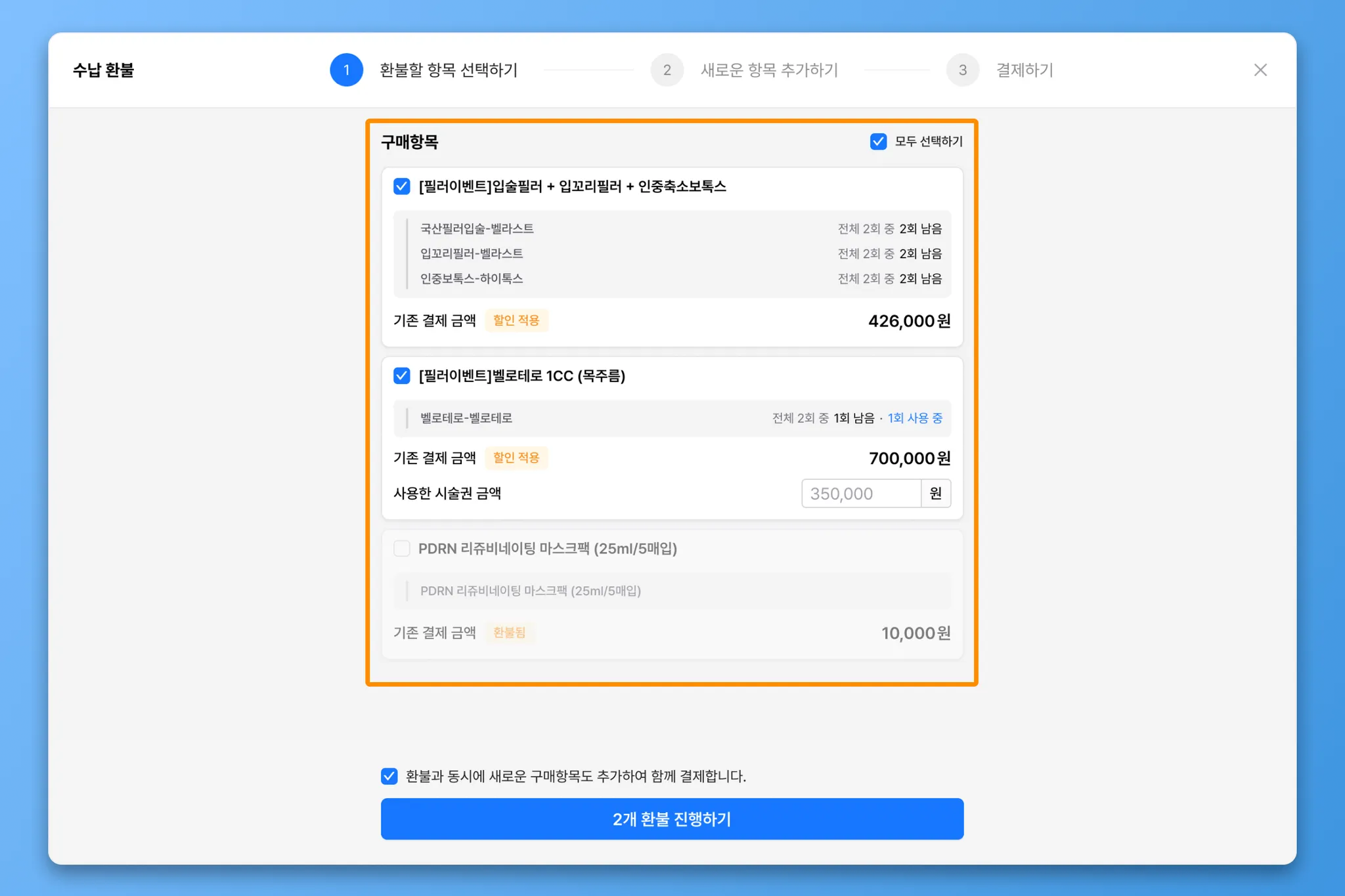 추가하여 함께 결제를 체크하고 환불을 진행하는 경우, 환불과 함께 결제할 새로운 구매항목을 담을 수 있습니다.앞서 선택한 환불 구매항목은