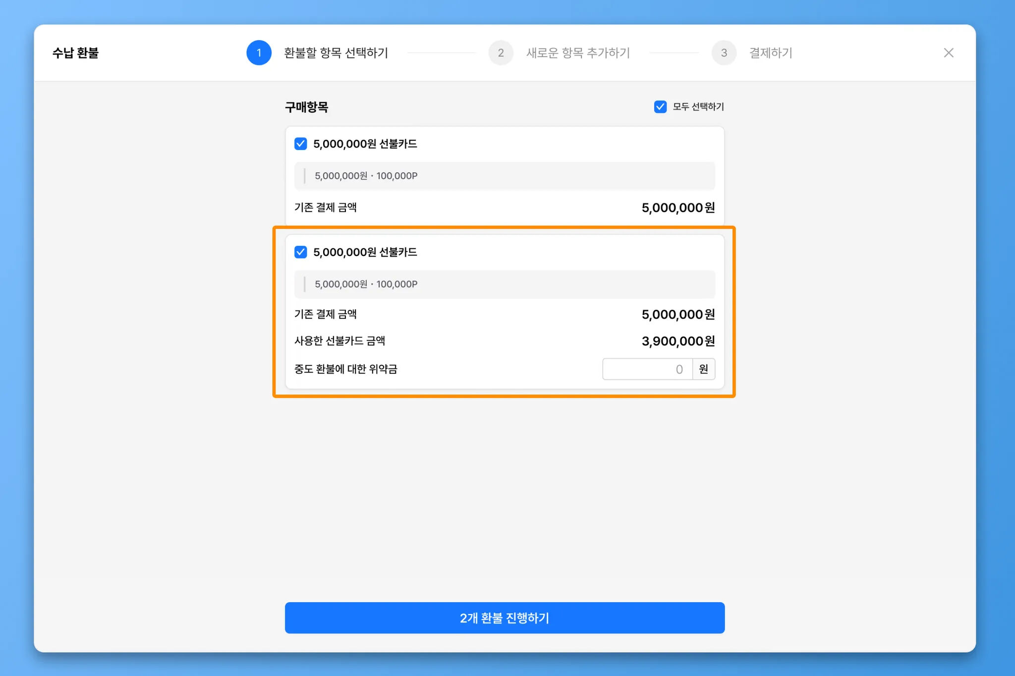 구매항목은 기본적으로 모두 선택된 상태이며, 환불을 원하지 않는 구매항목을 선택 해제할 수 있습니다.