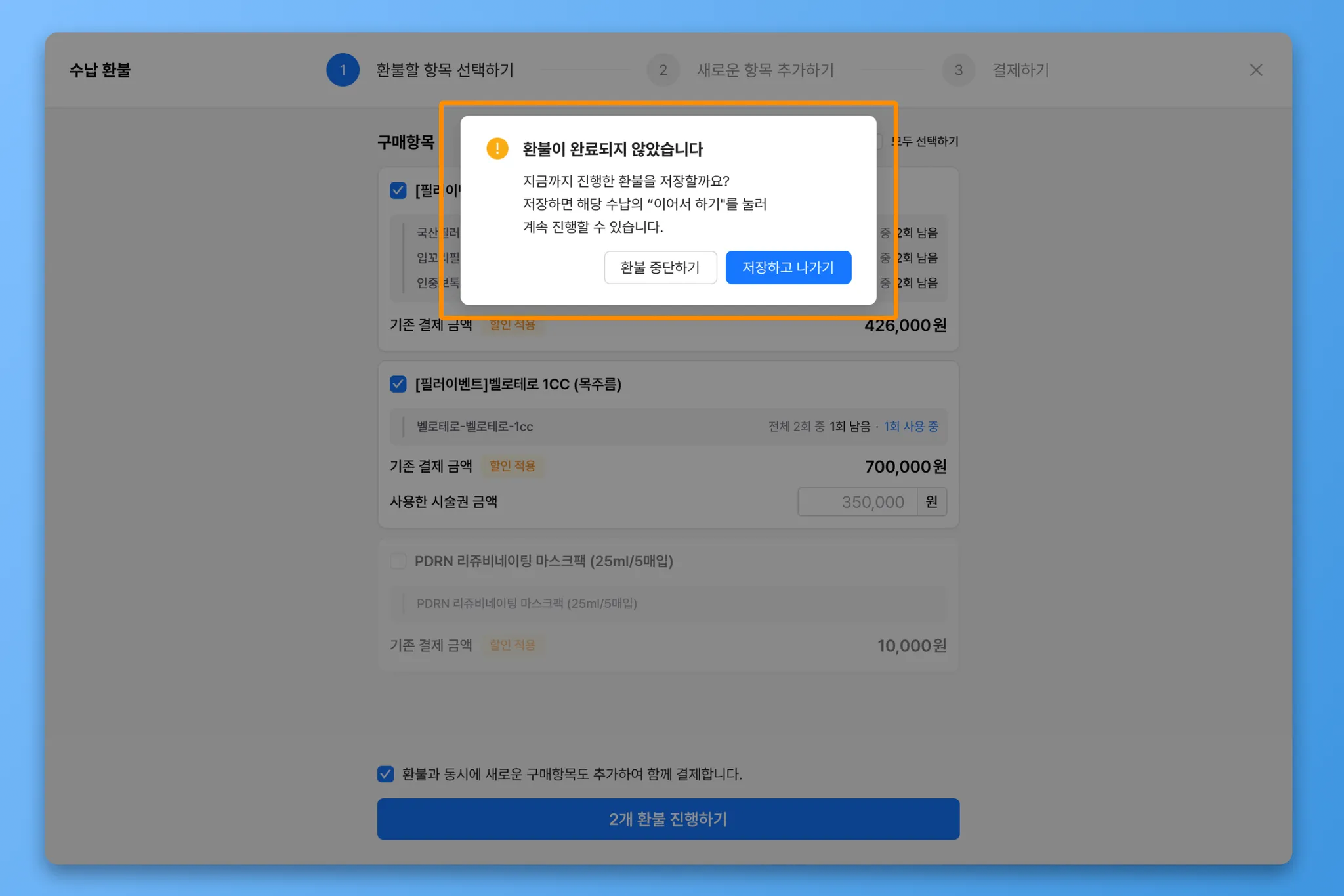 저장하고 화면을 나가면, 중단한 환불을 이어서 할 수 있습니다.
