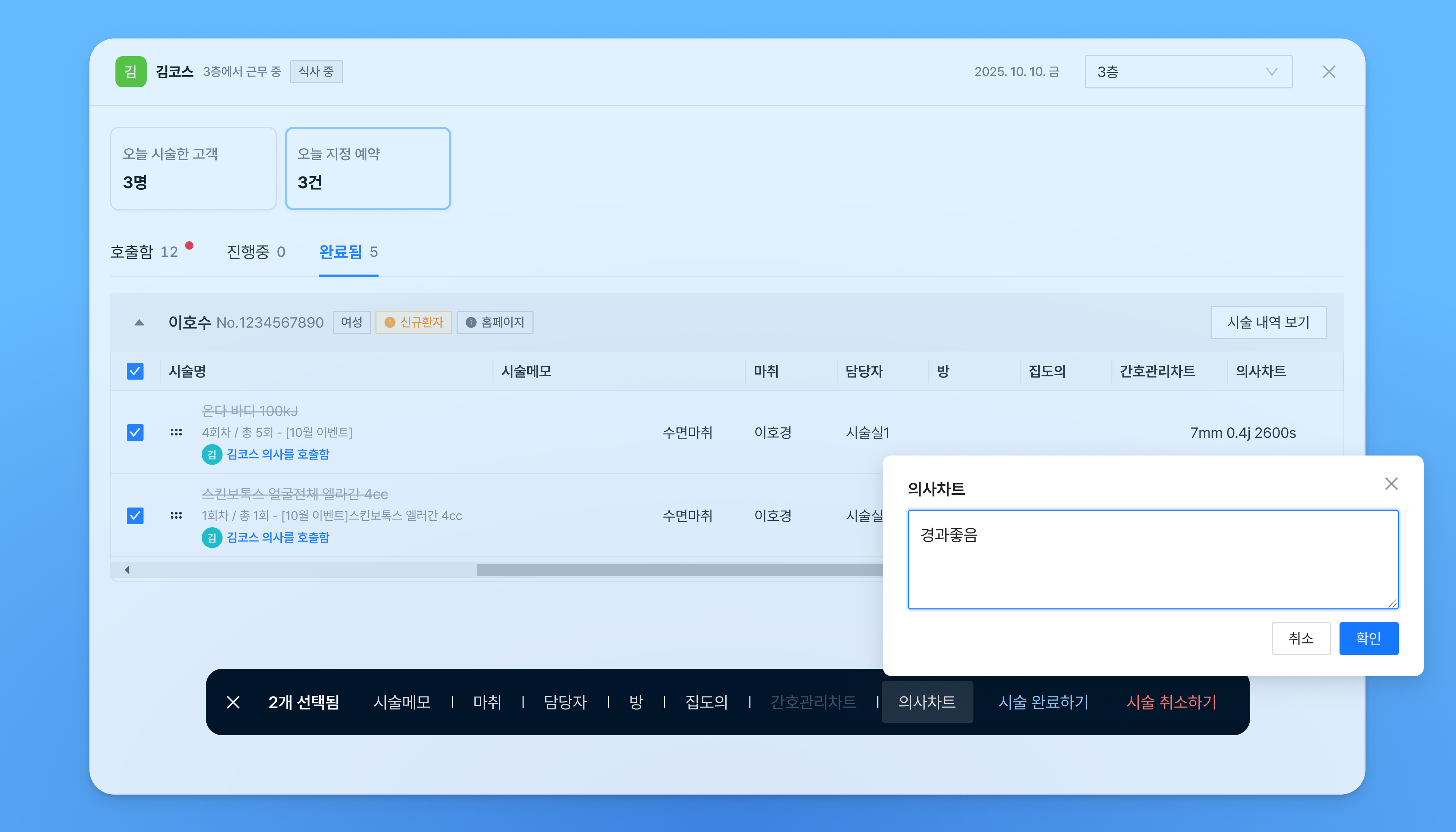 시술이 끝나면 바로 시술을 완료 처리할 수 있습니다.