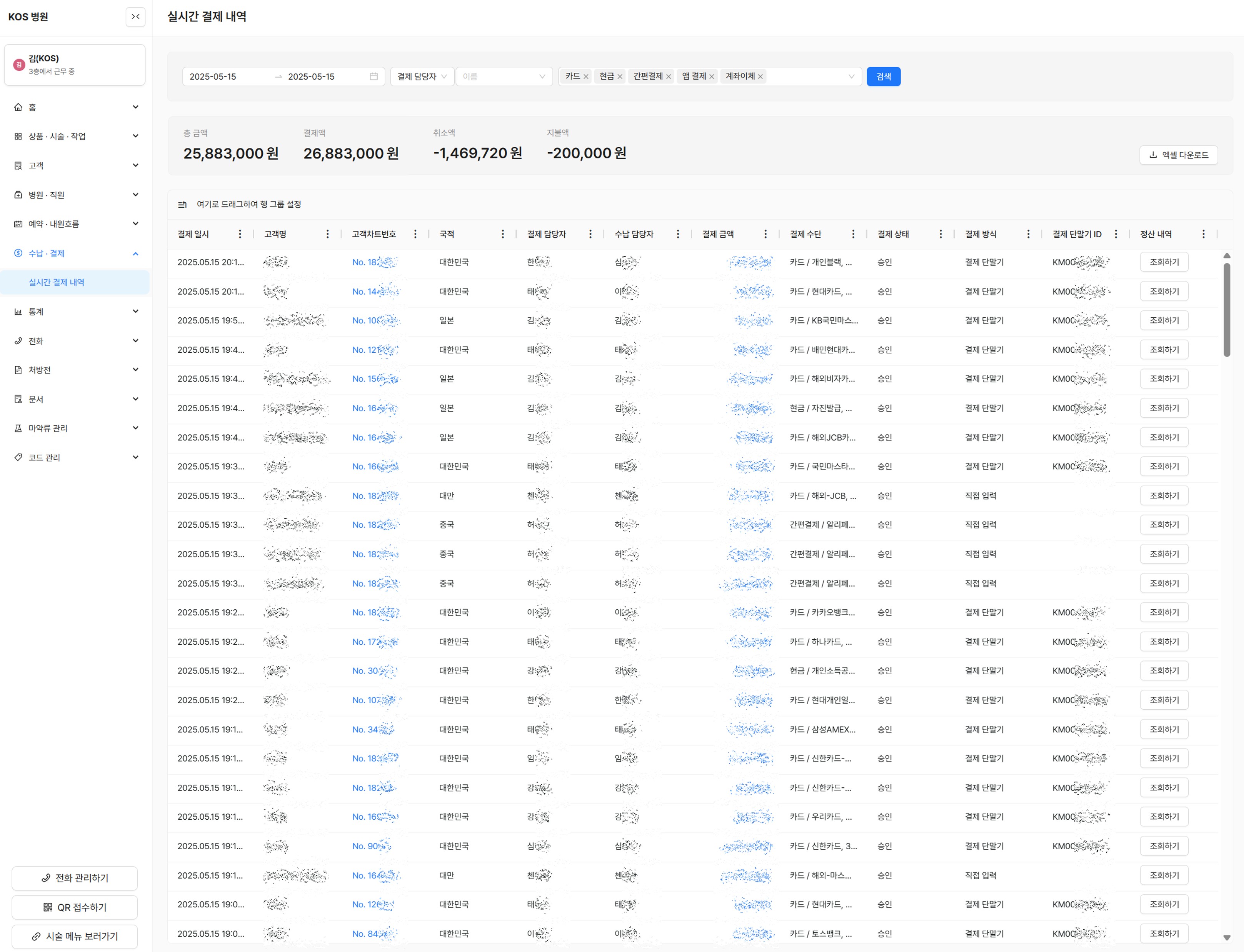 관리자 권한 외 직원은 자신이 수납/결제담당자인 실시간 결제내역만 볼 수 있습니다.