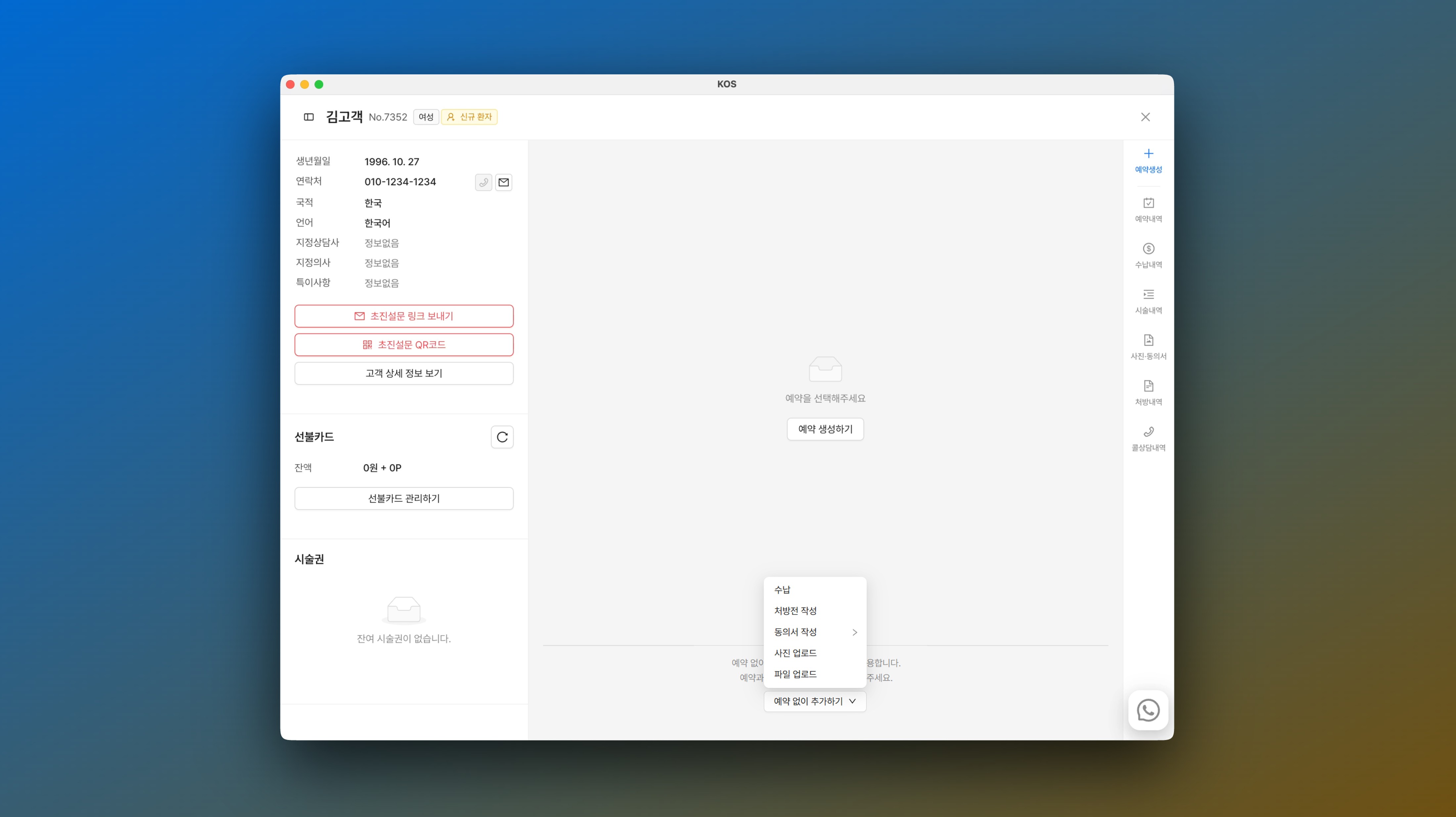 KOS는 예약을 기준으로 해당 예약일에 진행된 상담, 수납, 시술등을 기록하도록 구성되어있지만, 병원에서 고객이 내원하지 않은 경우에도 중요한 작업을 기록할 수 있도록 지원합니다.