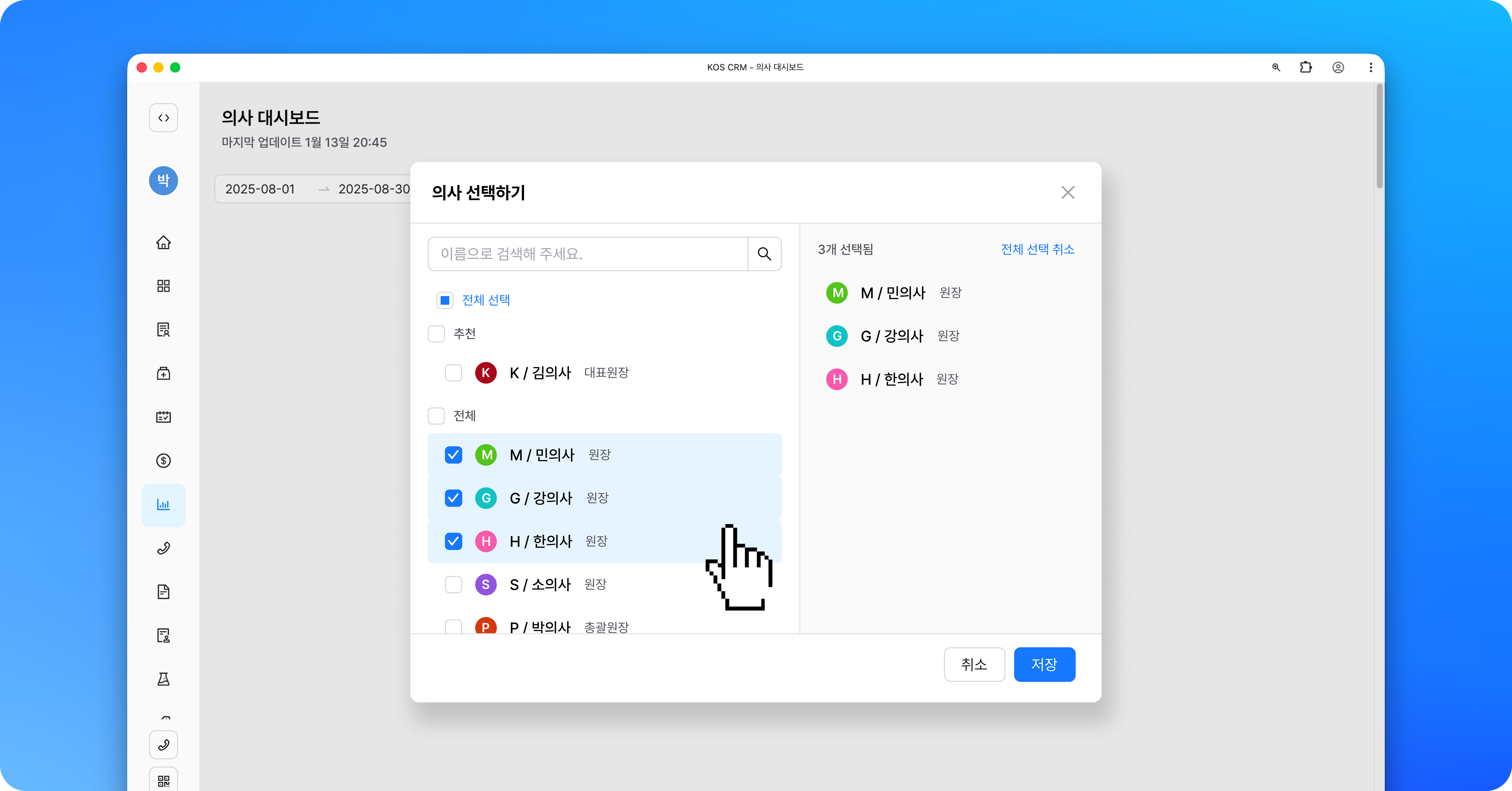 멀티 선택이 가능하며, 기본으로 모든 의사가 선택되어 있습니다.