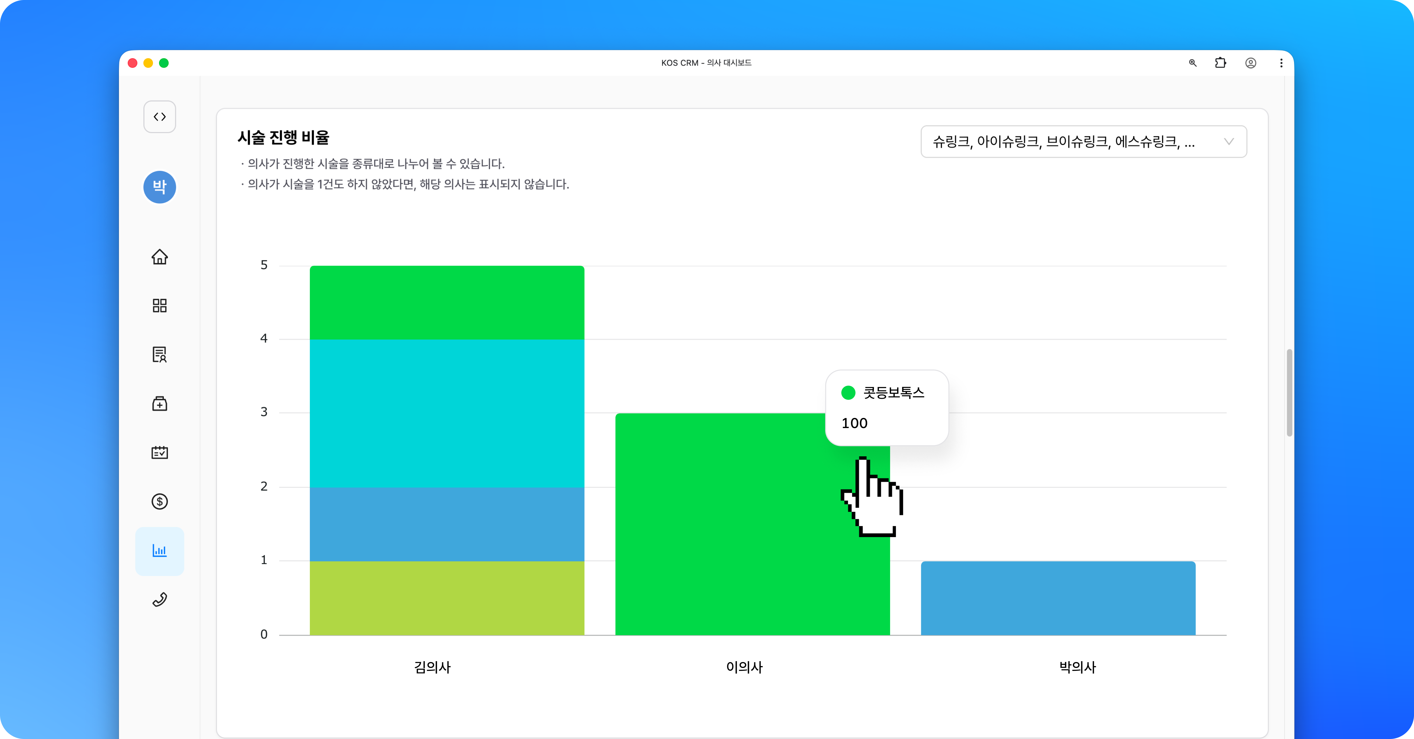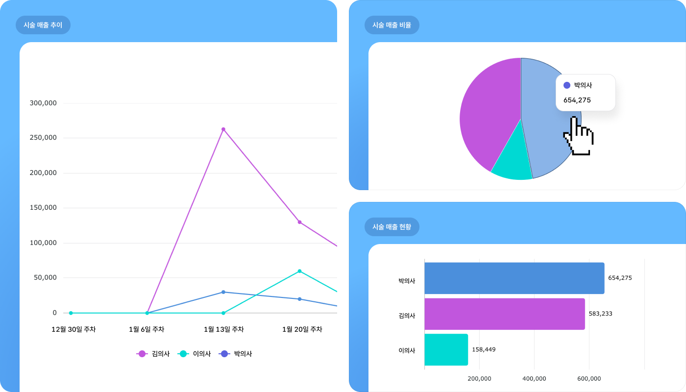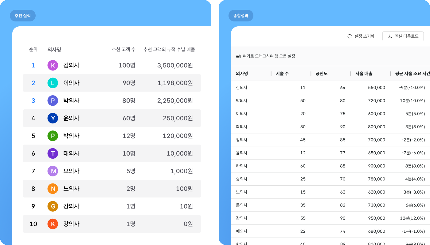 의사별 시술, 상담, 매출을 한 번에 비교할 수 있습니다.