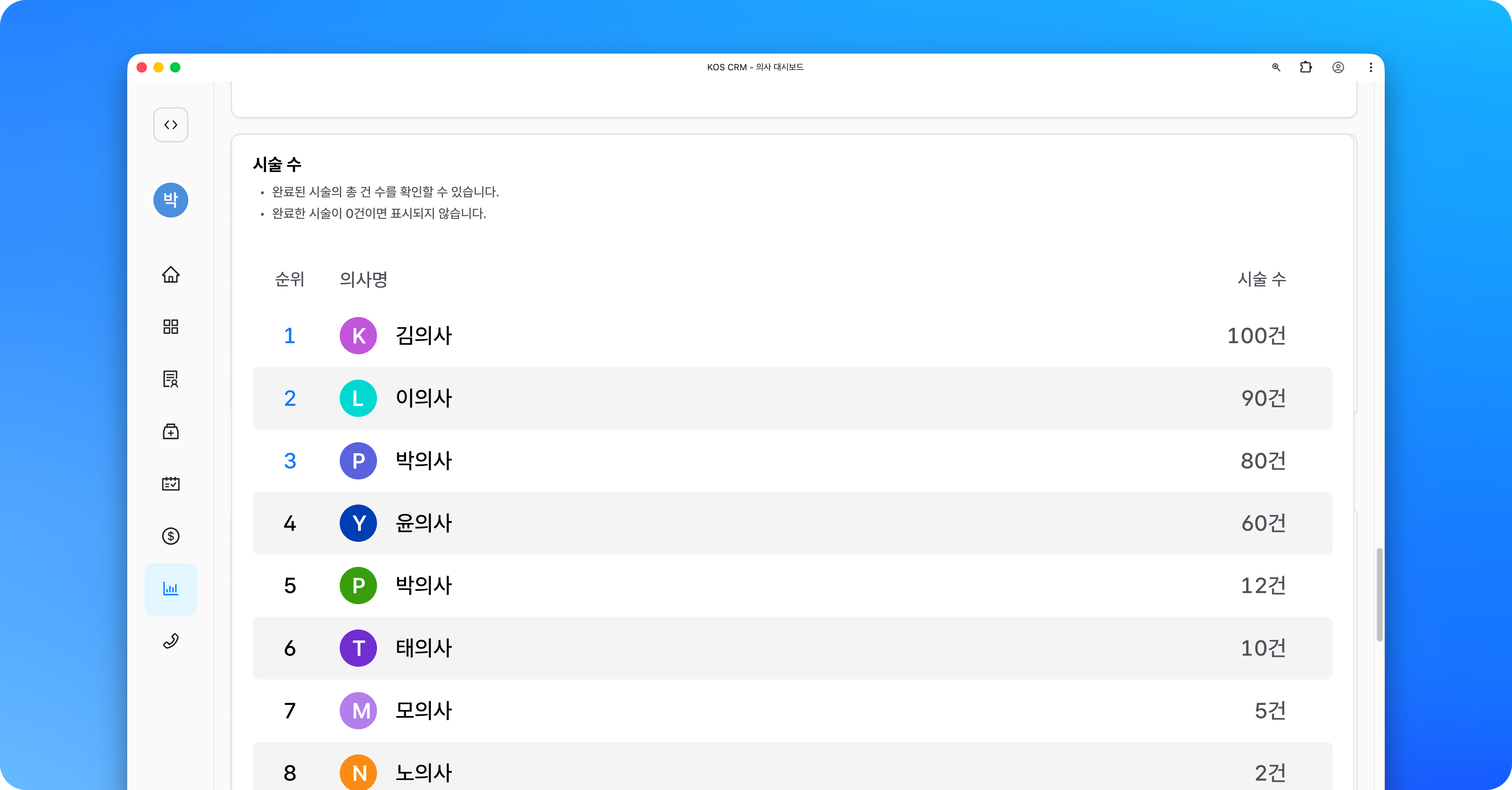 의사 별 완료된 시술 수를 기준으로 랭킹을 보여줍니다.