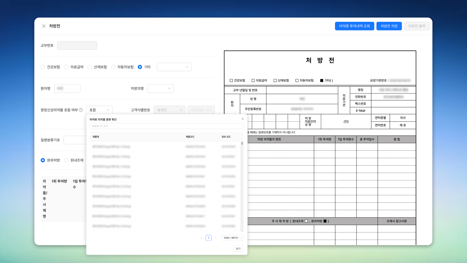 마약류 처방시 필수조건인 "마약류 투약내역 조회기능"을 NIMS와 연동하였습니다.