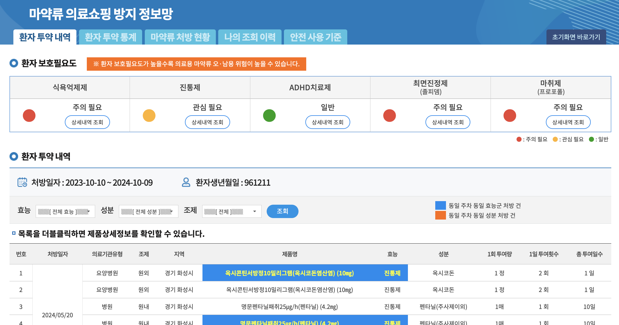 마약류가 포함된 처방인 경우, 해당 환자를 처방의사 계정으로 투약내역 조회한 적 있는지를 반드시 점검하고 처방을 낼 수 있도록 합니다. (한번만 병원의 대표자 키를 등록해두면 NIMS별도 접속 없이 빠르게 내역 체크가 가능합니다)