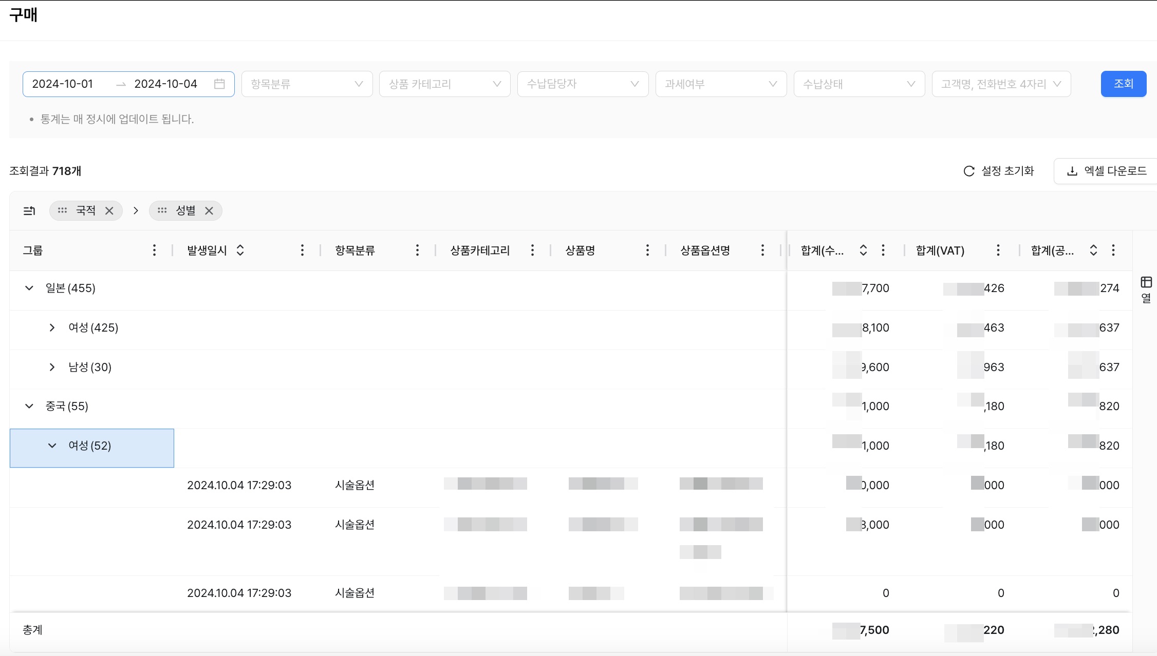 자유롭게 여러 레이어(예: 국가 + 성별)로 그룹핑을 해서 데이터를 묶어보고, 합산된 매출액이나 평균 시간등을 확인할 수 있습니다. 나아가 그 형태 그대로 엑셀 다운로드도 가능합니다.