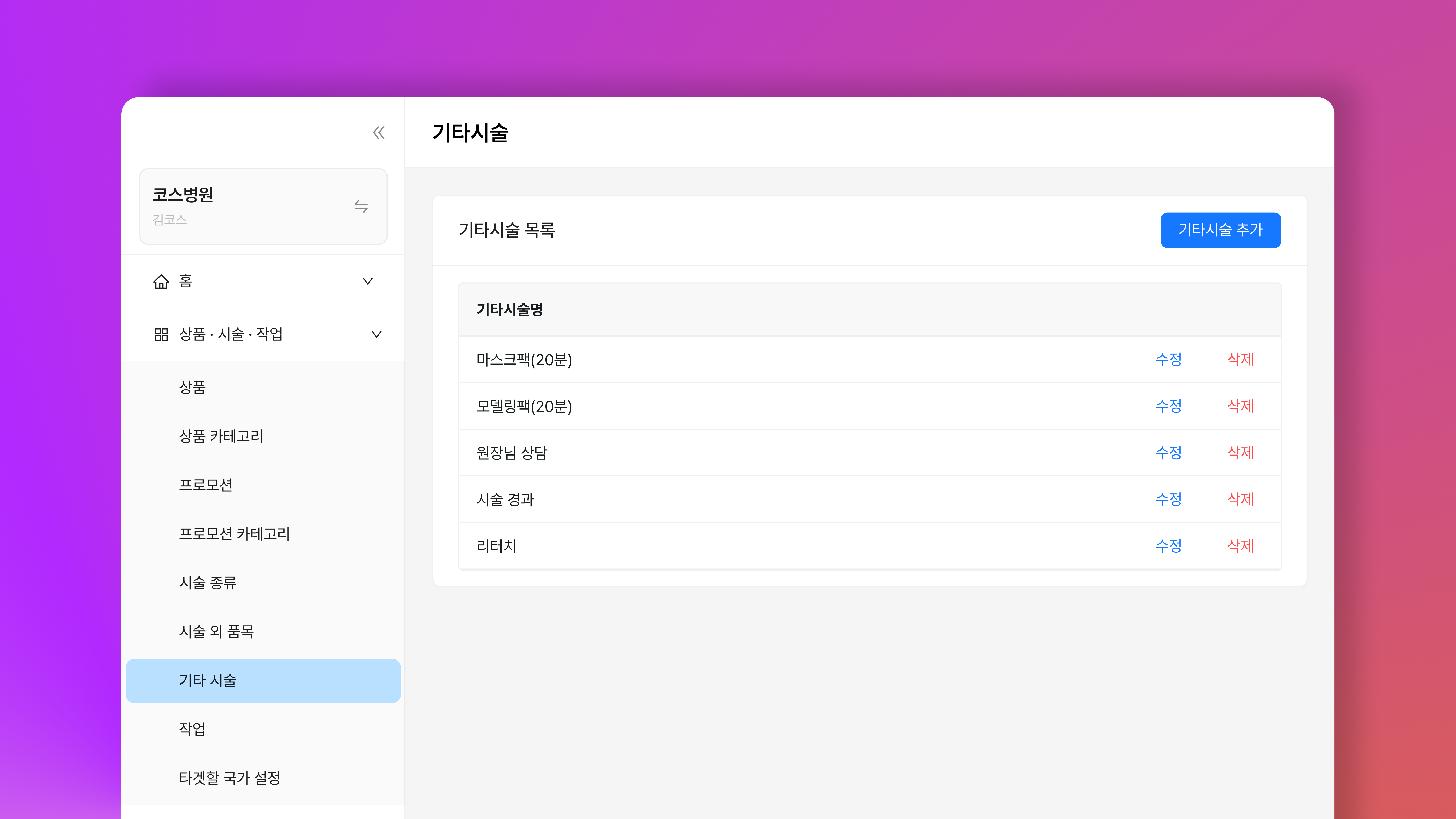 상품·시술·작업에서 추가할 수 있습니다.수정버튼을 누르면 이름을 변경할 수 있습니다.필요없는 항목은 삭제할 수 있습니다.