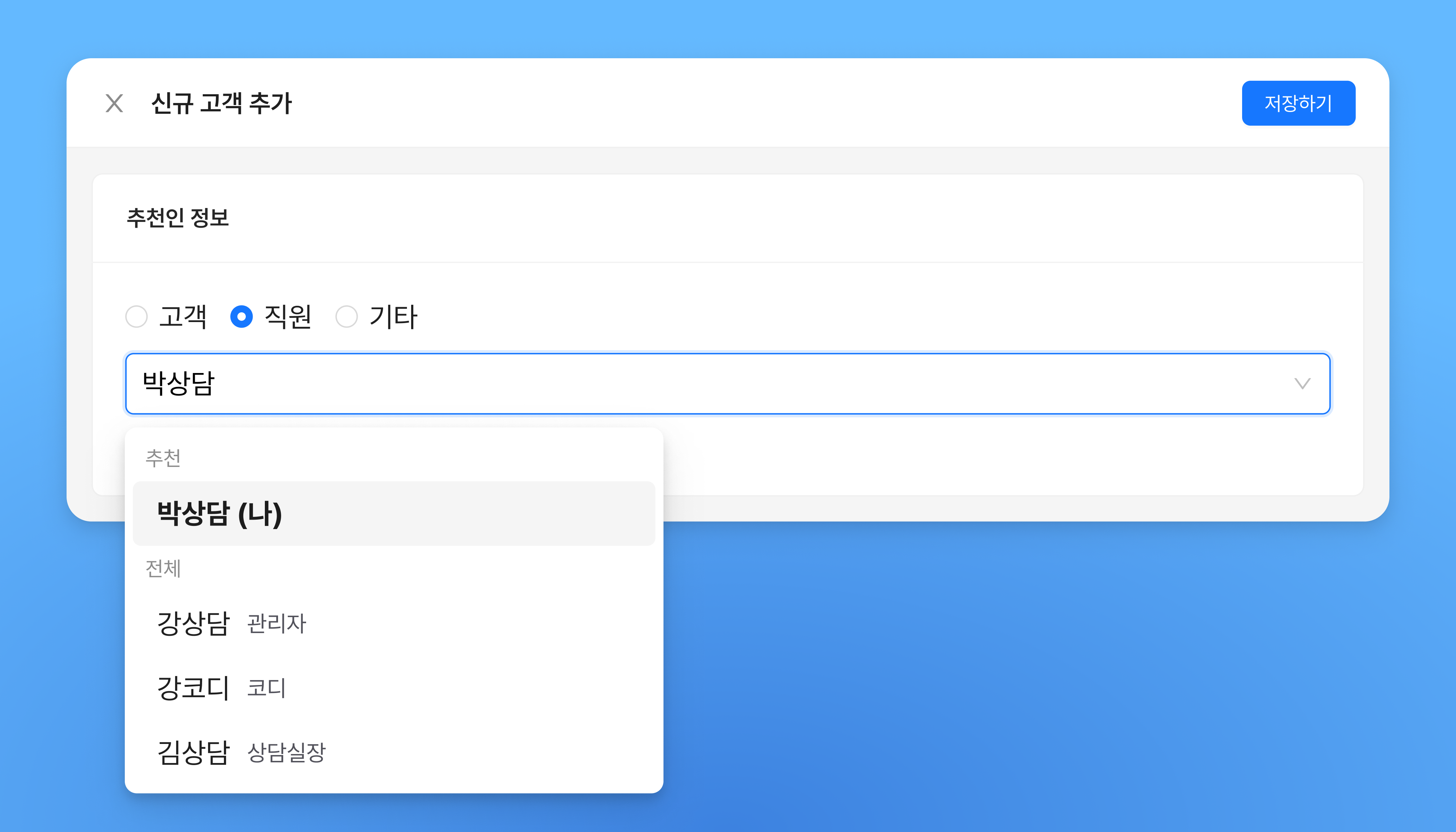 고객 정보 화면에서 추천인 유형을 선택해 등록할 수 있습니다.