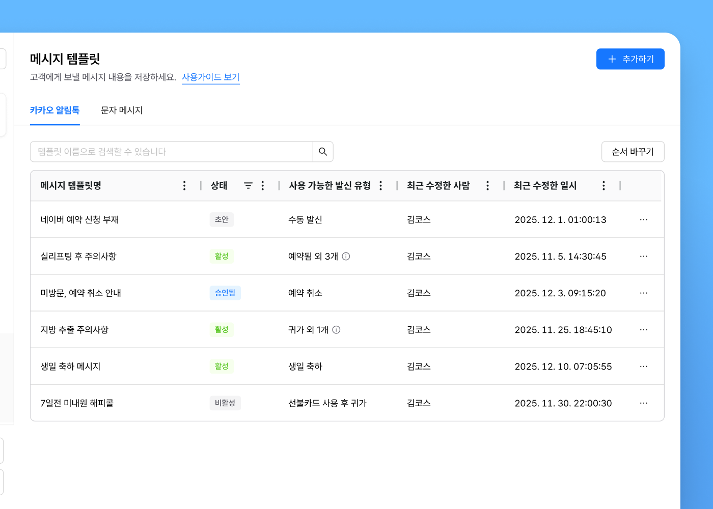 고객에게 카카오 알림톡 메시지를 보낼 수 있으며, 메시지 템플릿을 관리할 수 있습니다.
