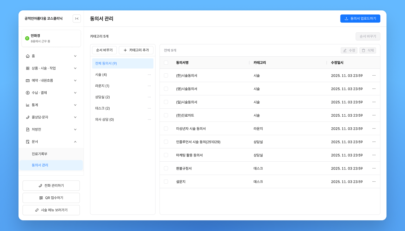 시술·수술 동의서, 개인정보 동의서 등 병원이 사용하는 문서를 KOS에 저장하고, 카테고리별로 정리하여 빠르게 찾거나 동의서 작성 등에 활용할 수 있는 기능입니다.
