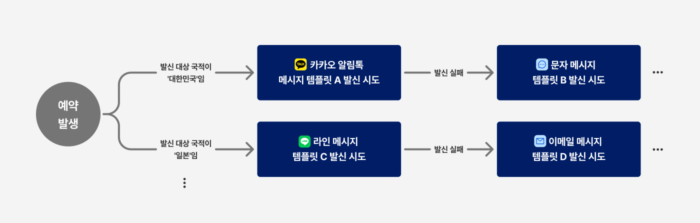 발신 대상 고객의 국적에 따라 다른 메시지가 발신되도록 설정할 수 있습니다. 특정 발신 수단으로 발신 실패 시 자동으로 다음 우선순위의 템플릿으로 발신합니다.