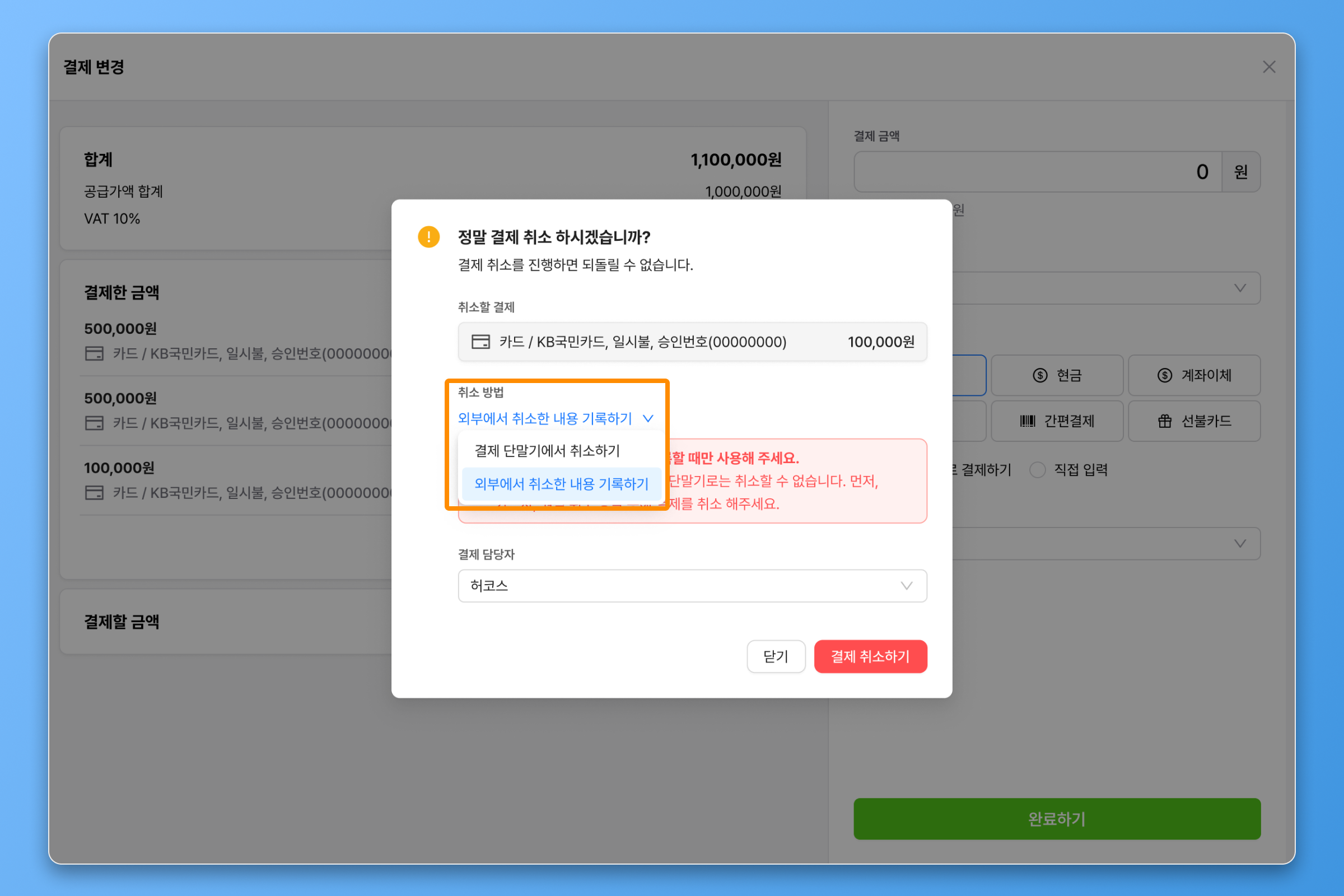 카드 단말기나 앱 결제 취소 등이 아닌, 현금 혹은 계좌이체로 고객에게 돈을 돌려주어야 할 때, 별도로 기록할 수 있습니다.