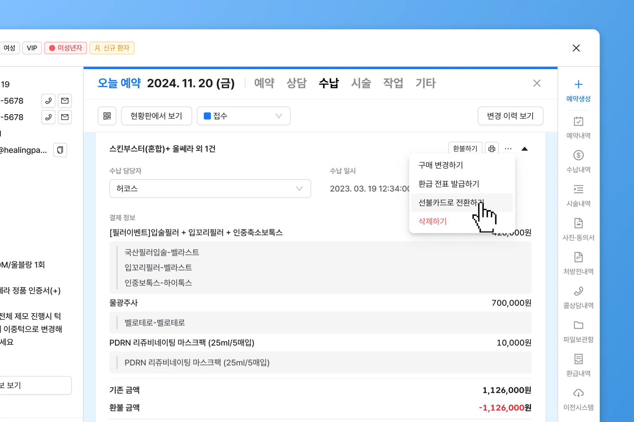 시술 수납에 있는 기존 결제를 취소하지 않고, 그 금액을 선불카드 수납을 위해 사용합니다. 기존에 고객이 결제한 금액에 차액만 더 결제하여 선불카드를 구매할 수 있습니다.