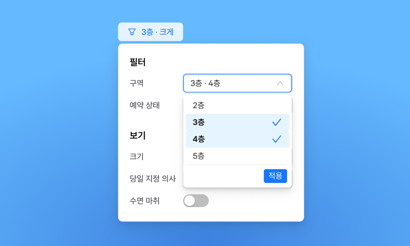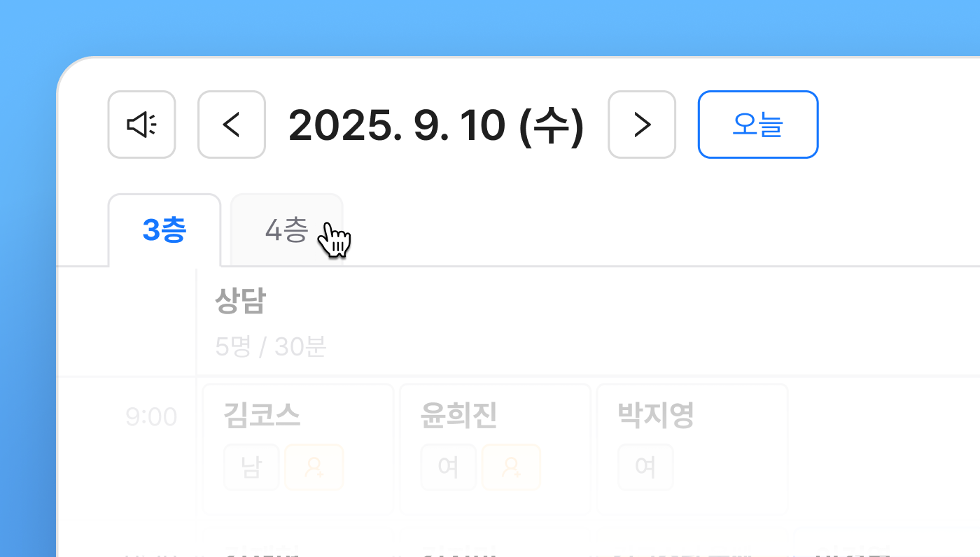 우리 병원의 모든 구역을 탭으로 확인할 수 있습니다.