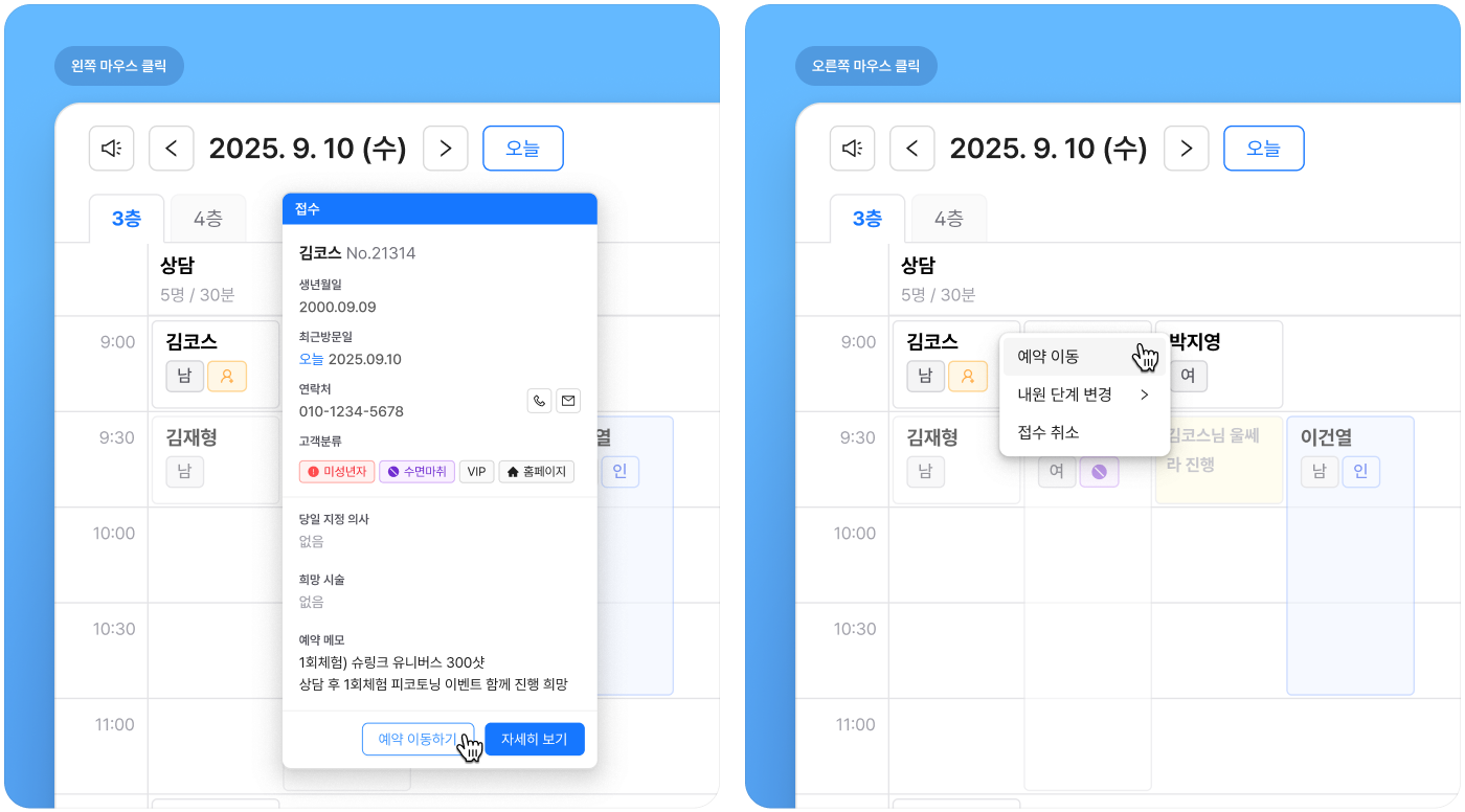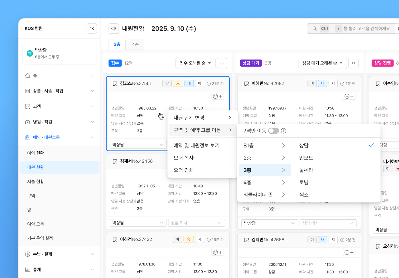 내원 현황과 시술 현황에서 고객차트를 열지 않고, 고객 카드를 우클릭하여 다른 구역과 예약 그룹으로 쉽게 변경할 수 있습니다.