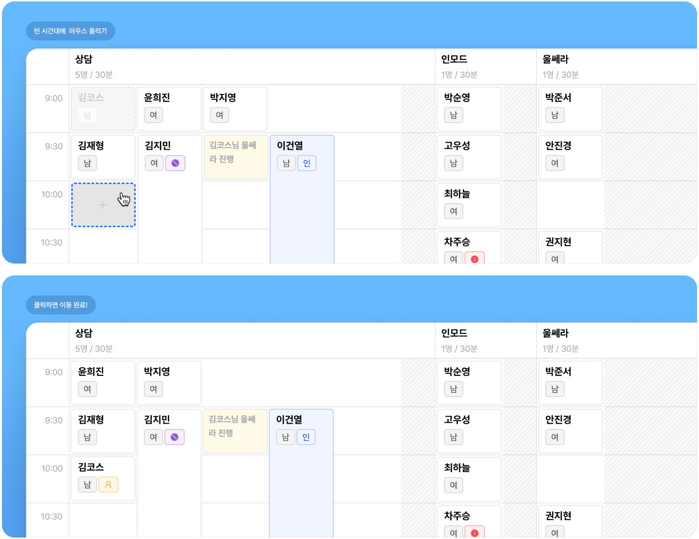 빈 시간대를 누르면 예약 이동이 완료됩니다.