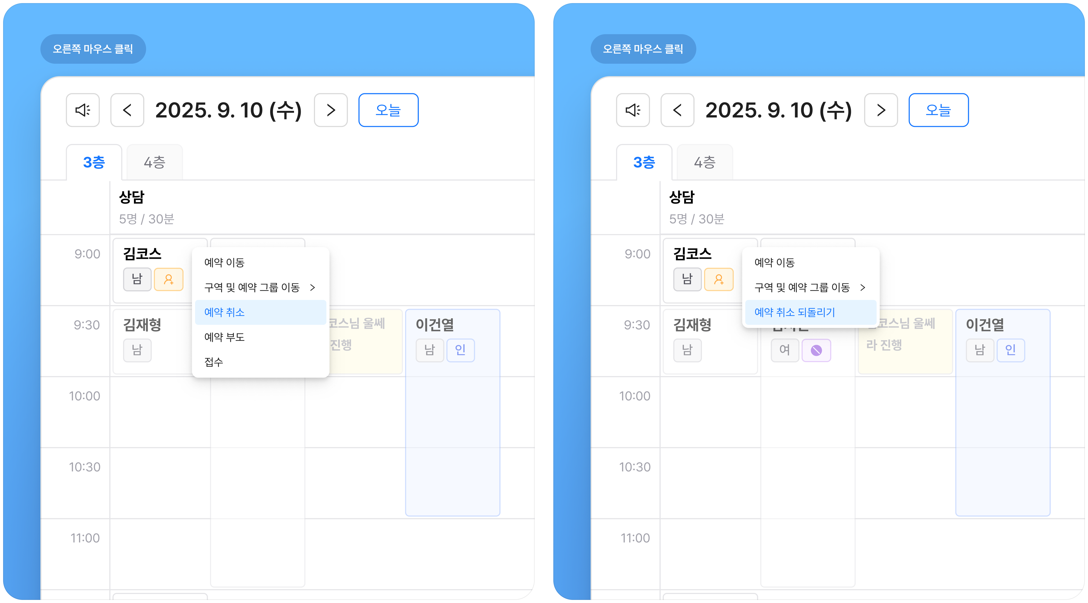고객 차트: '예약 취소 되돌리기' 를 클릭하여 예약 취소/부도를 되돌릴 수 있습니다.