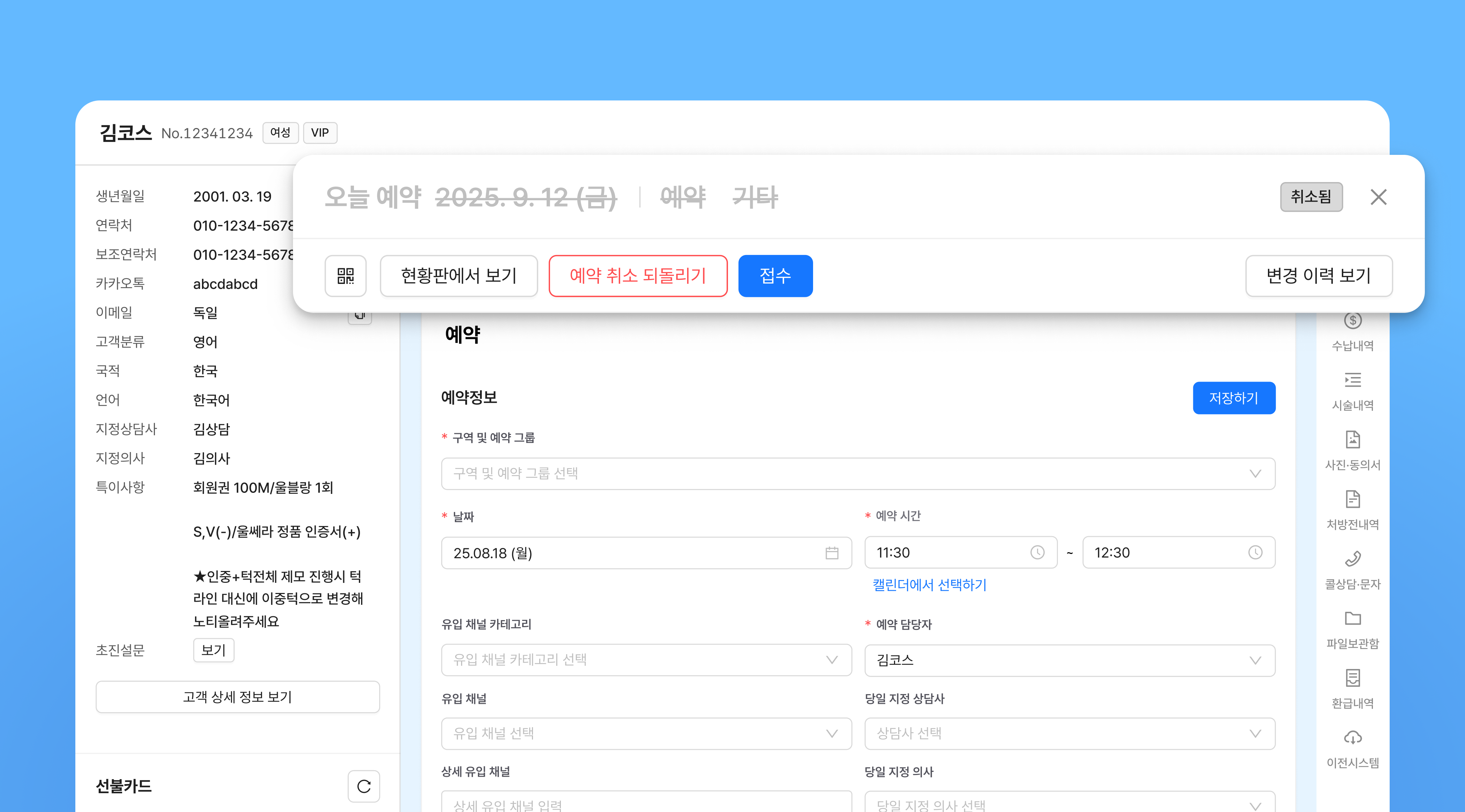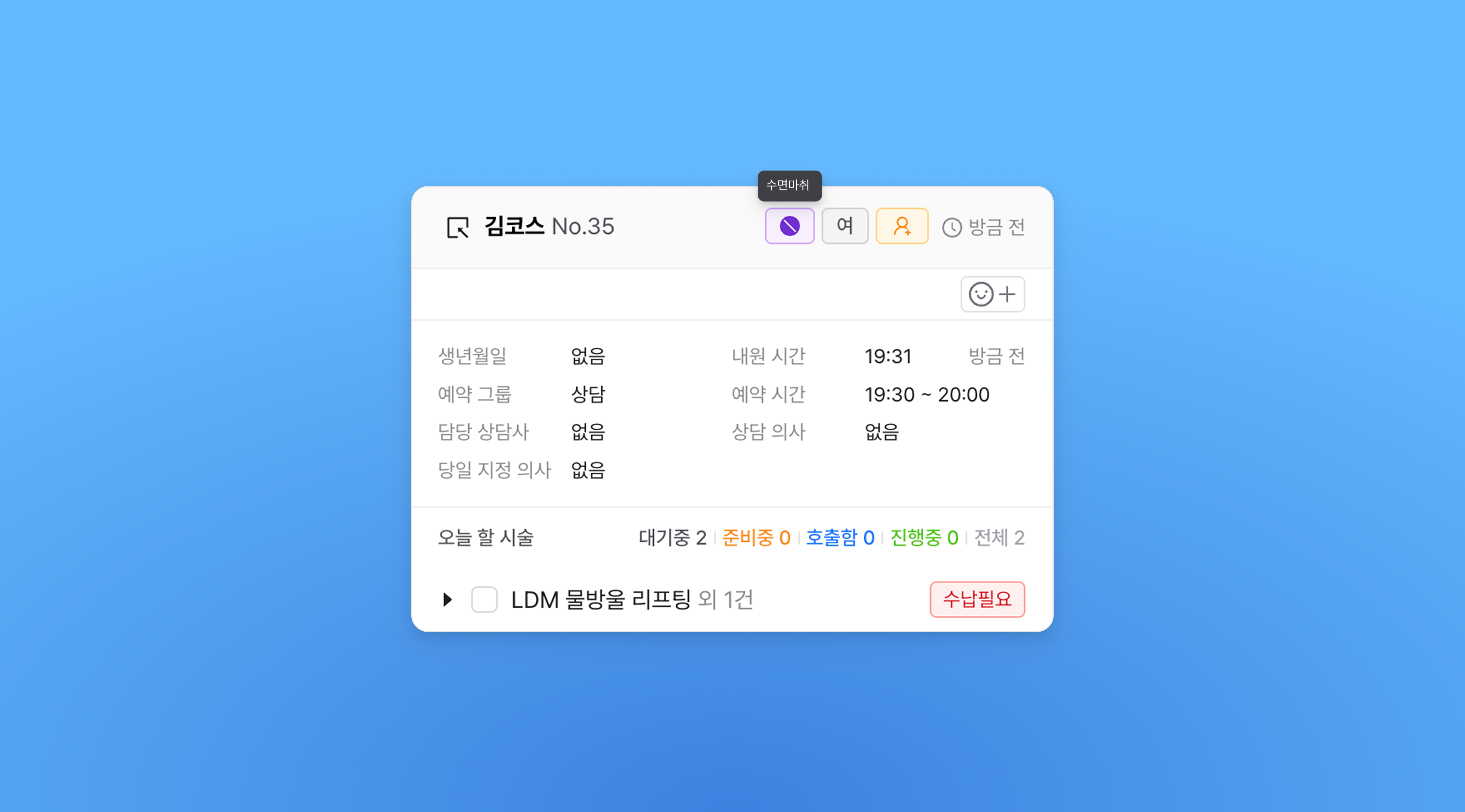 고객 카드 상단에서 수면 마취 표시를 바로 확인할 수 있습니다.