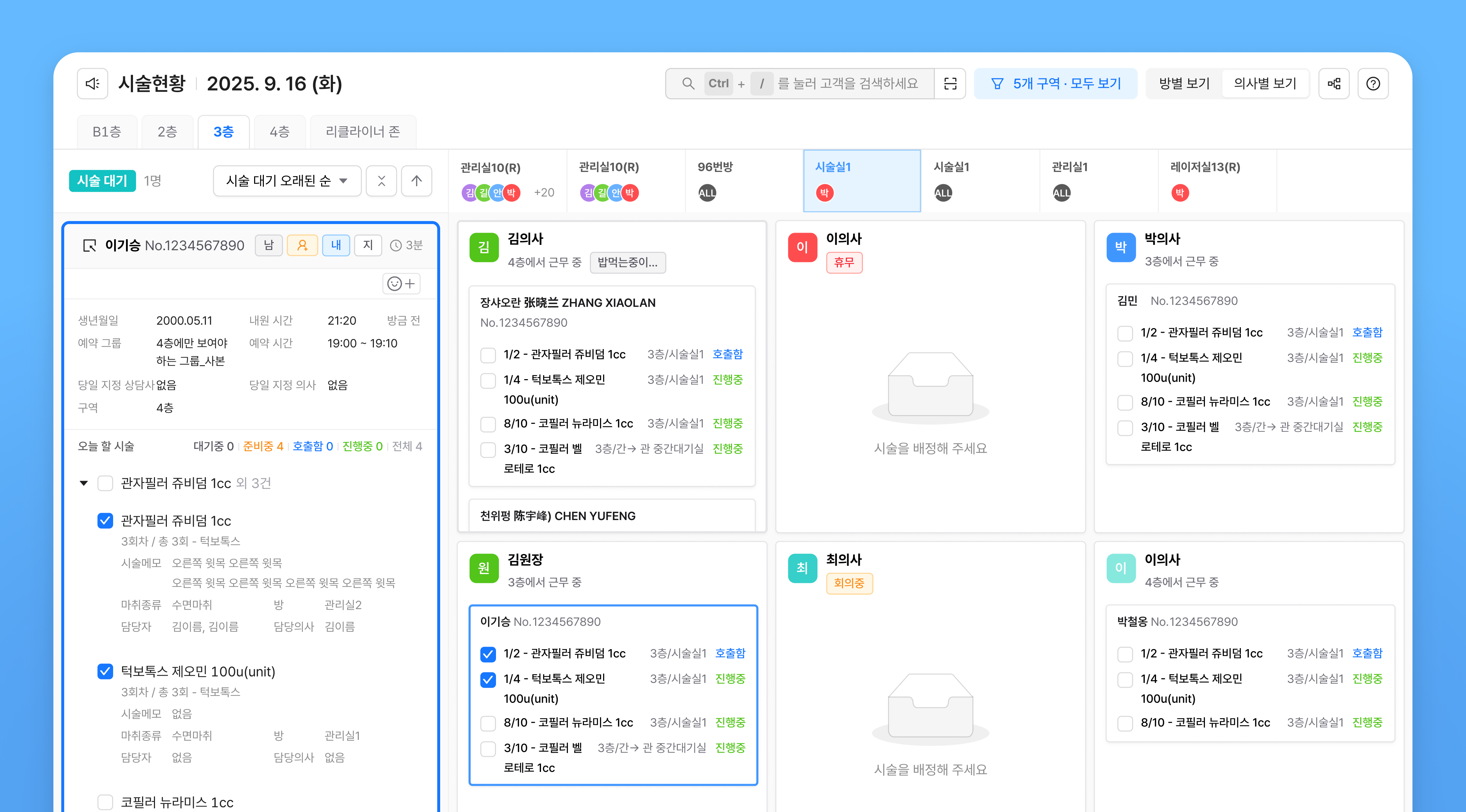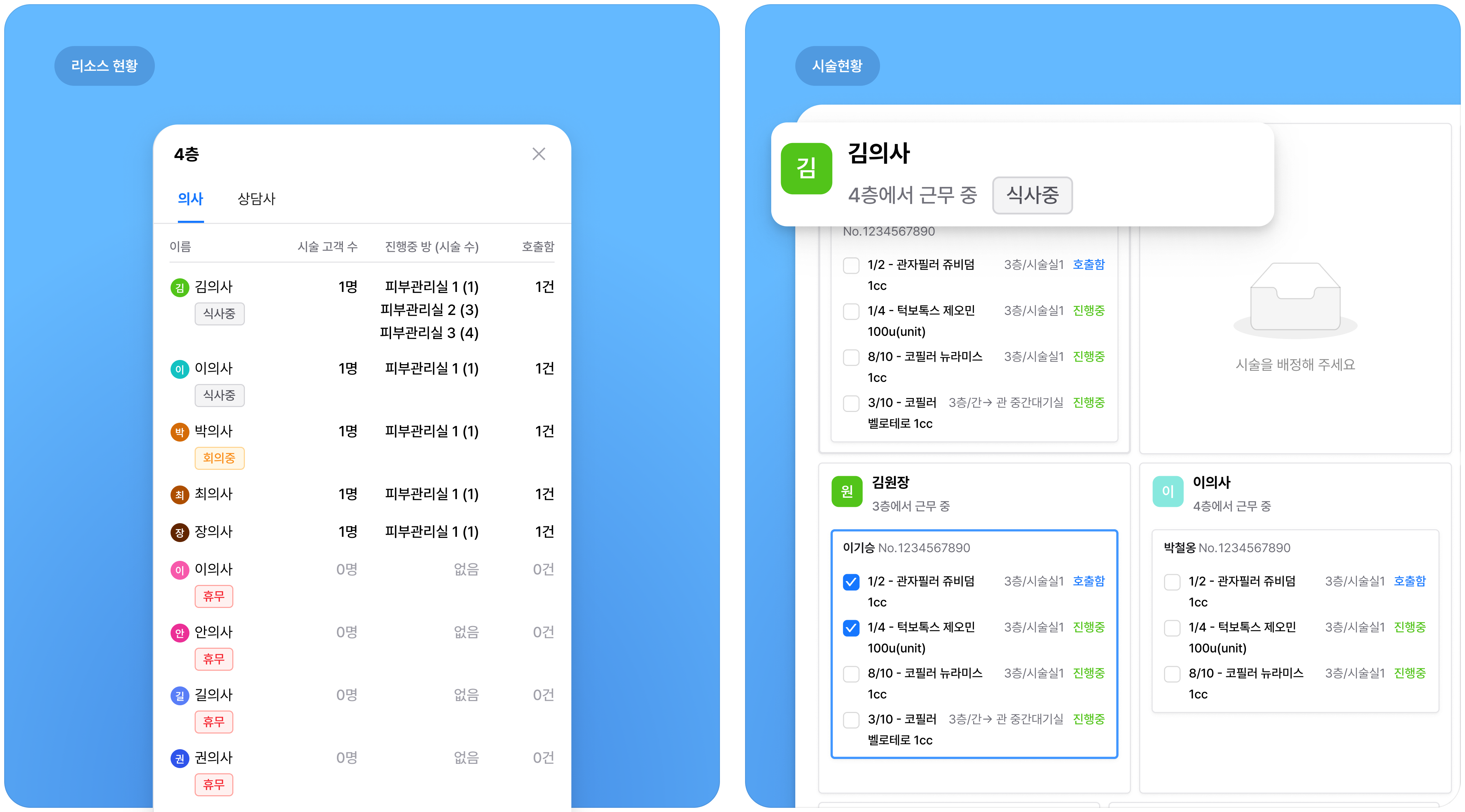 [의사별 보기]에서는 의사별로 진행중인 시술, 호출받은 시술을 확인할 수 있습니다.