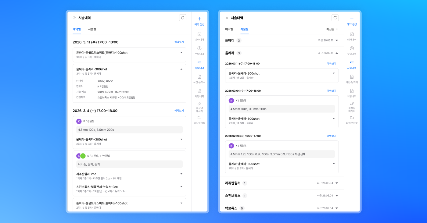 고객차트의 ‘시술별’ 기준으로 시술 내역을 확인할 수 있습니다.